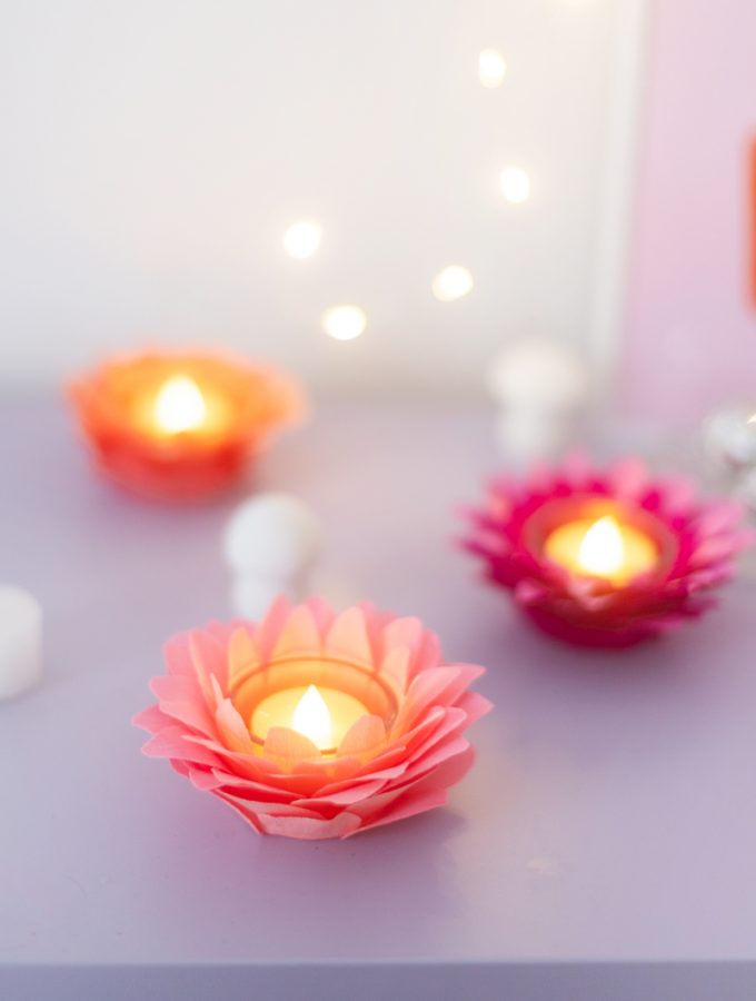 Für mein Projekt habe ich mich für ein Geldgeschenk entschieden, das auch nach dem Schenken eine richtig schicke Deko ist: nämlich Krepppapier-Blumen in der Glaskuppel. Dazwischen verstecken sich Geldscheine, die ich wie Blütenblätter gefaltet habe.