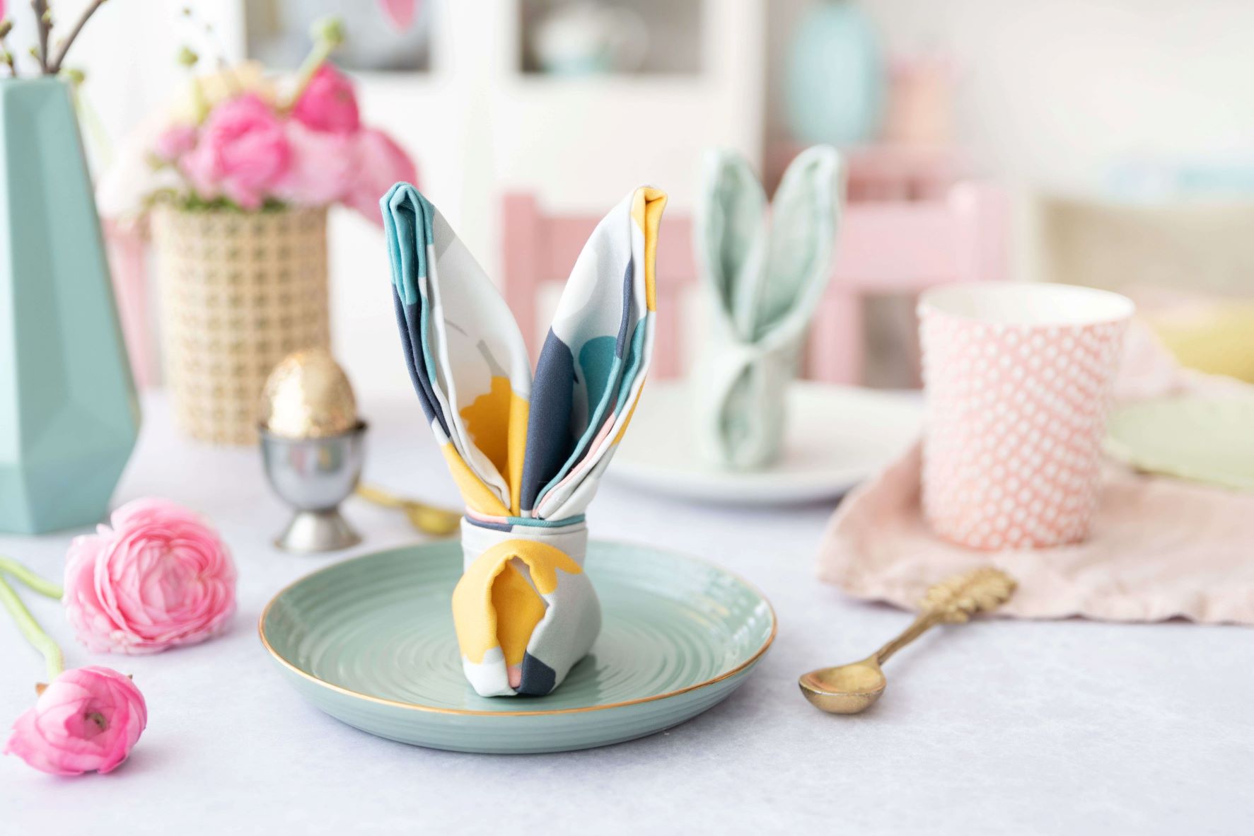 Wenn die Gäste zum Osterfest eintrudeln, darf eine liebevoll gedeckte Tafel nicht fehlen. Verzaubere deine Ostertafel mit süßen Osterhasen aus Stoffservietten! Du findest hier, wie du sie ganz einfach falten und deine Tischdekoration zum Fest noch liebevoller gestalten kannst.
