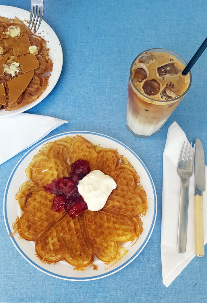 Probiert unbedingt die Waffeln! Die gibt es einmal mit Kirschen und einmal mit norwegischem Braunkäse. Dazu gibt es extrem leckere Smoothies oder alle möglichen Kaffeegetränke.