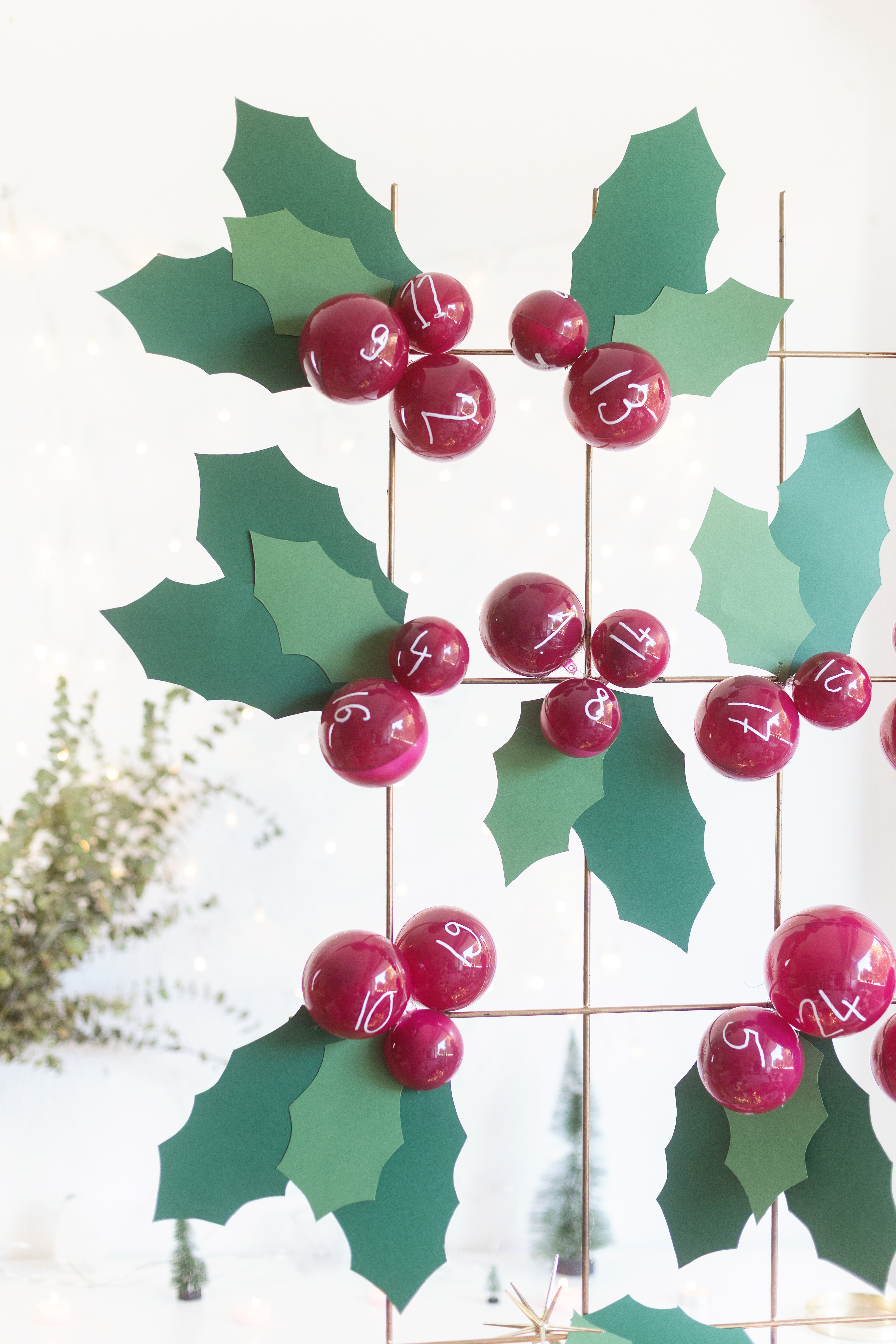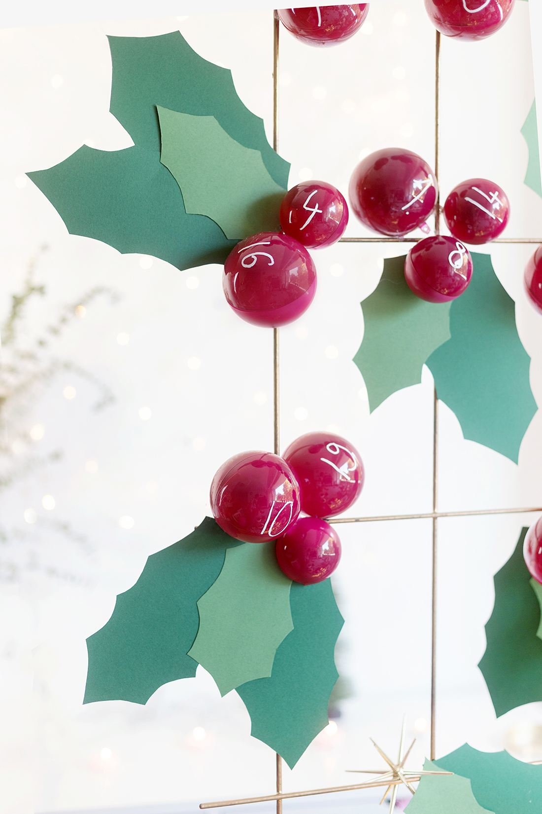 Wir haben November – also ist in meinen Augen allerhöchste Zeit, an Weihnachten zu denken! 😀 Ich liebe Weihnachten, Adventskalender und alles drumherum. Für Tchibo habe ich mir eine DIY-Idee für einen Adventskalender überlegt, den man immer wieder verwenden kann. Der Adventskalender ist in Stechpalmen-Optik gehalten. Die roten „Beeren“ sind aus Acrylkugeln gemacht, die man öffnen kann. Hier kommen die Geschenke rein!