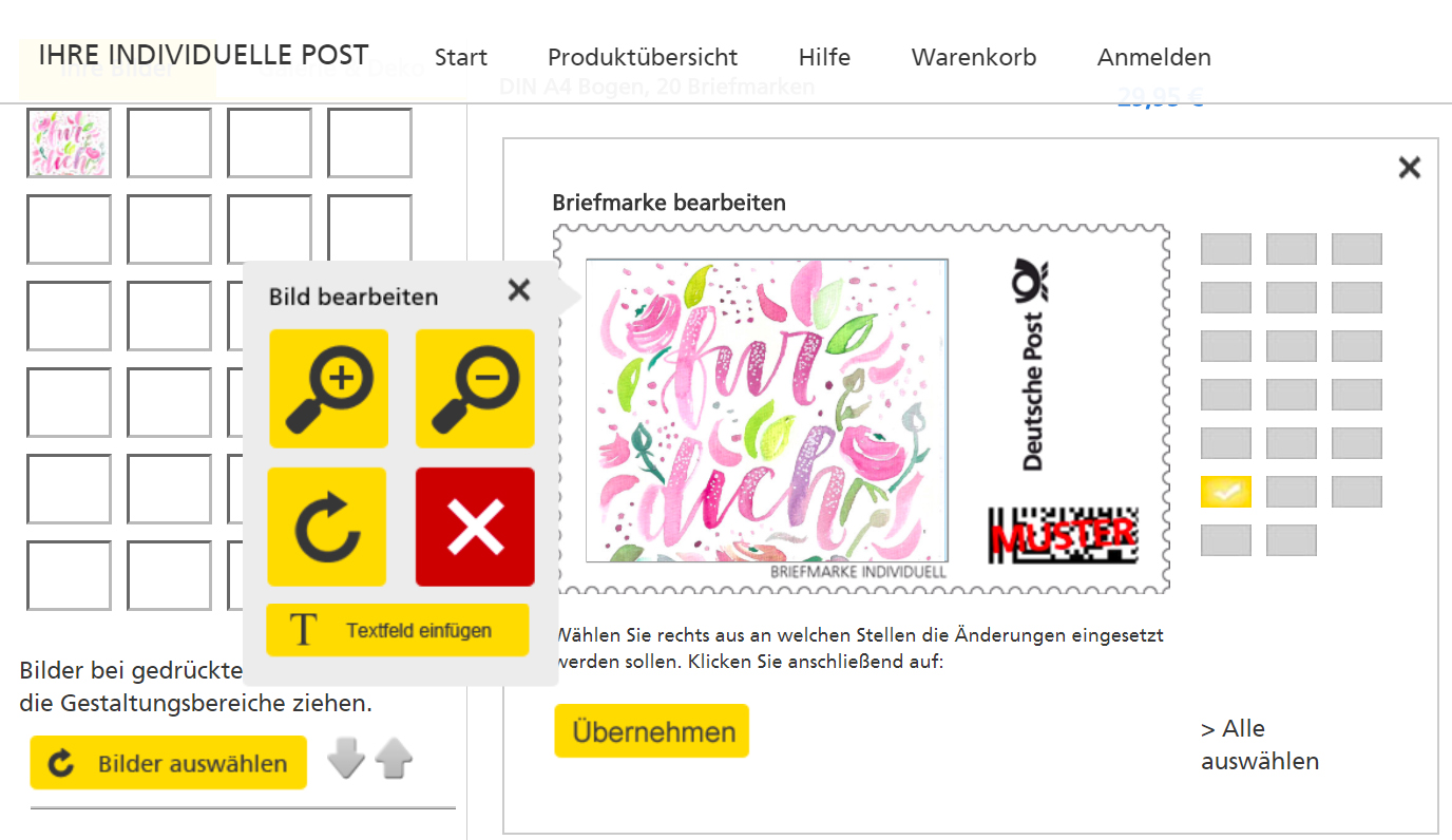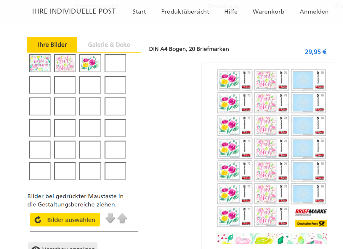Du kannst deine eigenen Briefmarken auf dieser Seite eine Briefmarke Individuell der Deutschen Post gestalten, die dann an dich geschickt wird! Briefmarke Individuell ist bereits ab 29,95 € für 20 individuell gestaltbare Briefmarken verfügbar. 🙂
