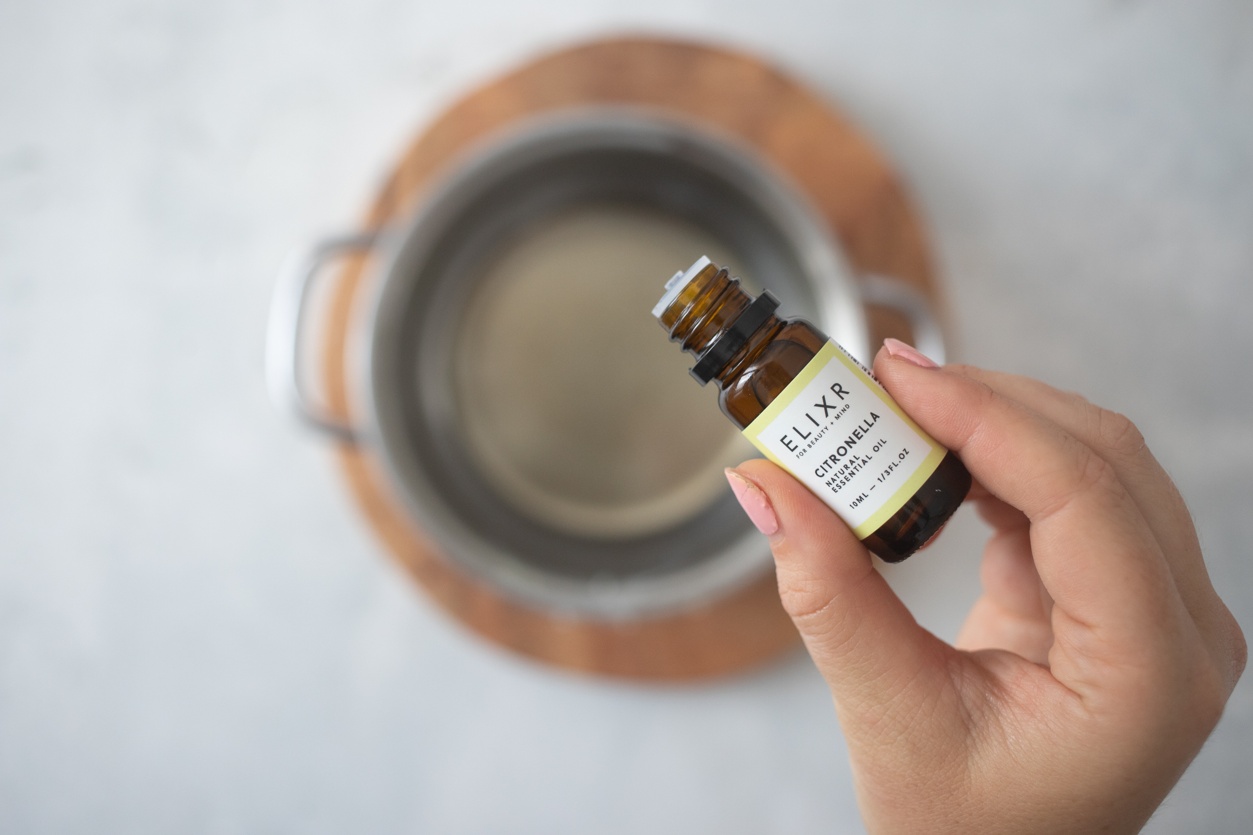 2. Gib nun einige Tropfen (8 – 10) Citronella-Öl in das flüssige Wachs.