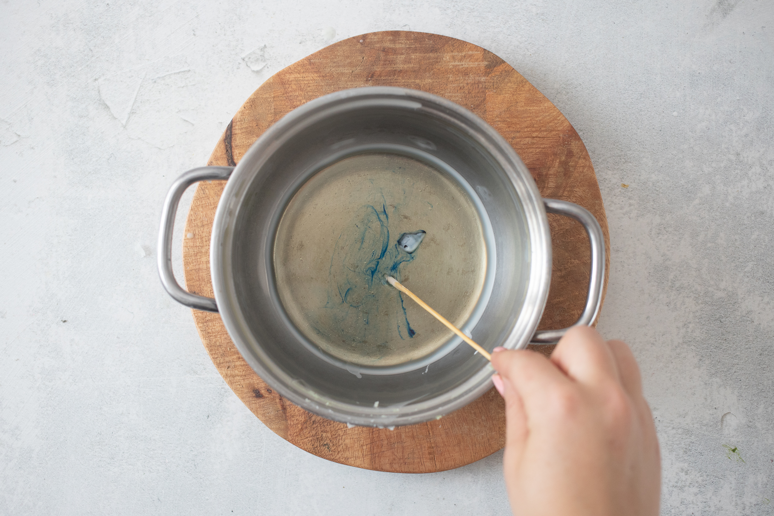 4. Gib die Wachsfarbe in den Topf und rühre sie um, bis sie sich gut mit dem flüssigen Wachs vermischt hat.