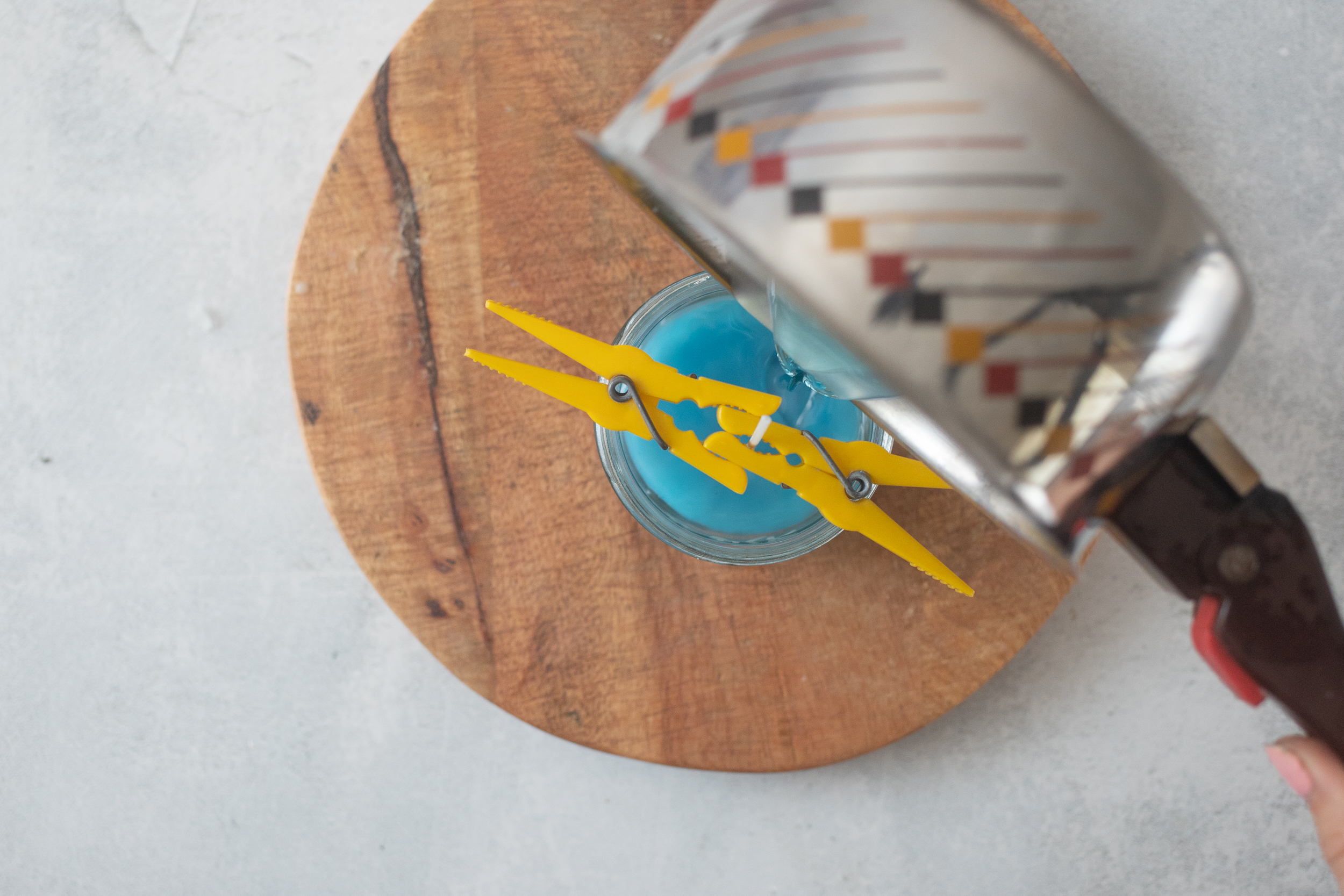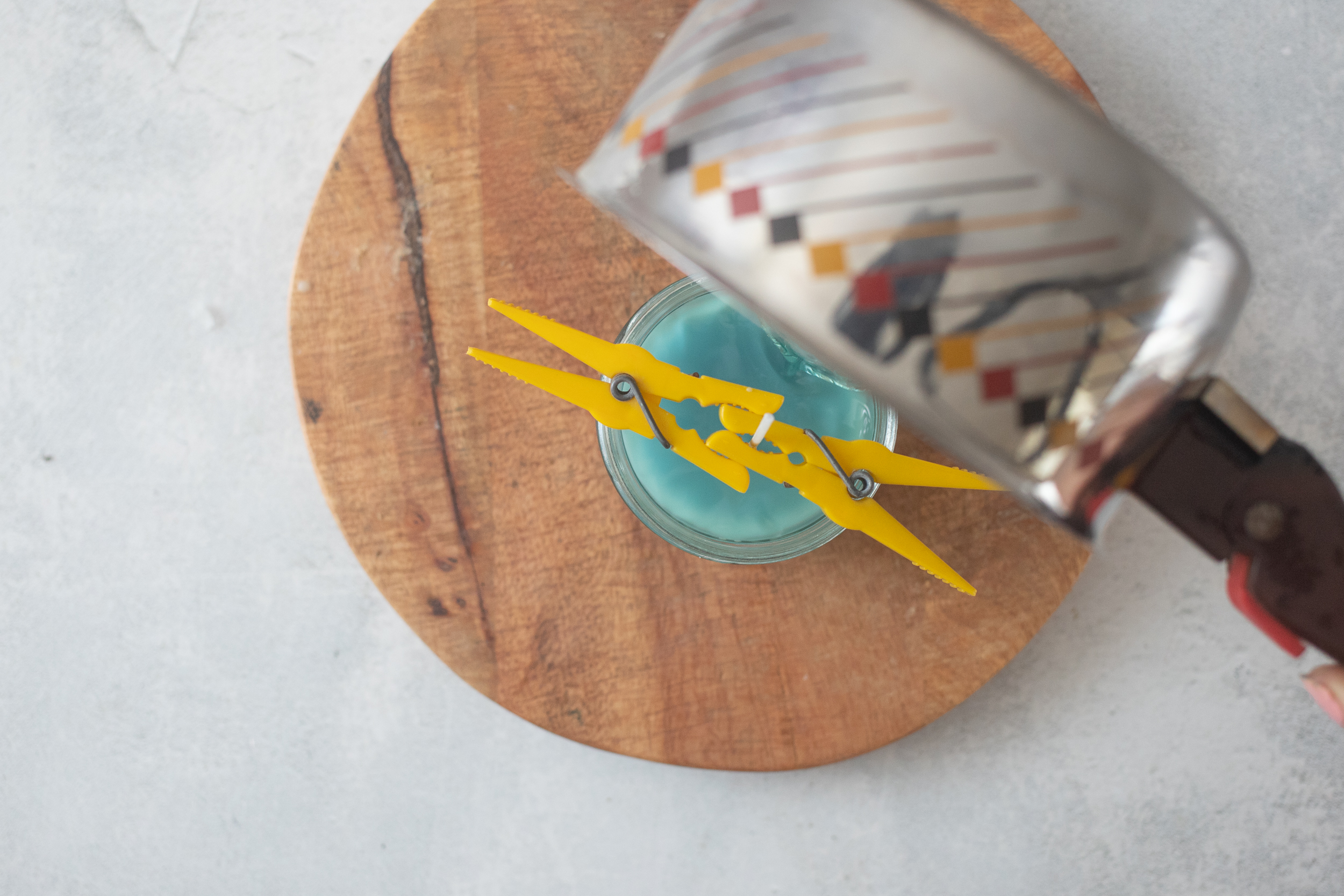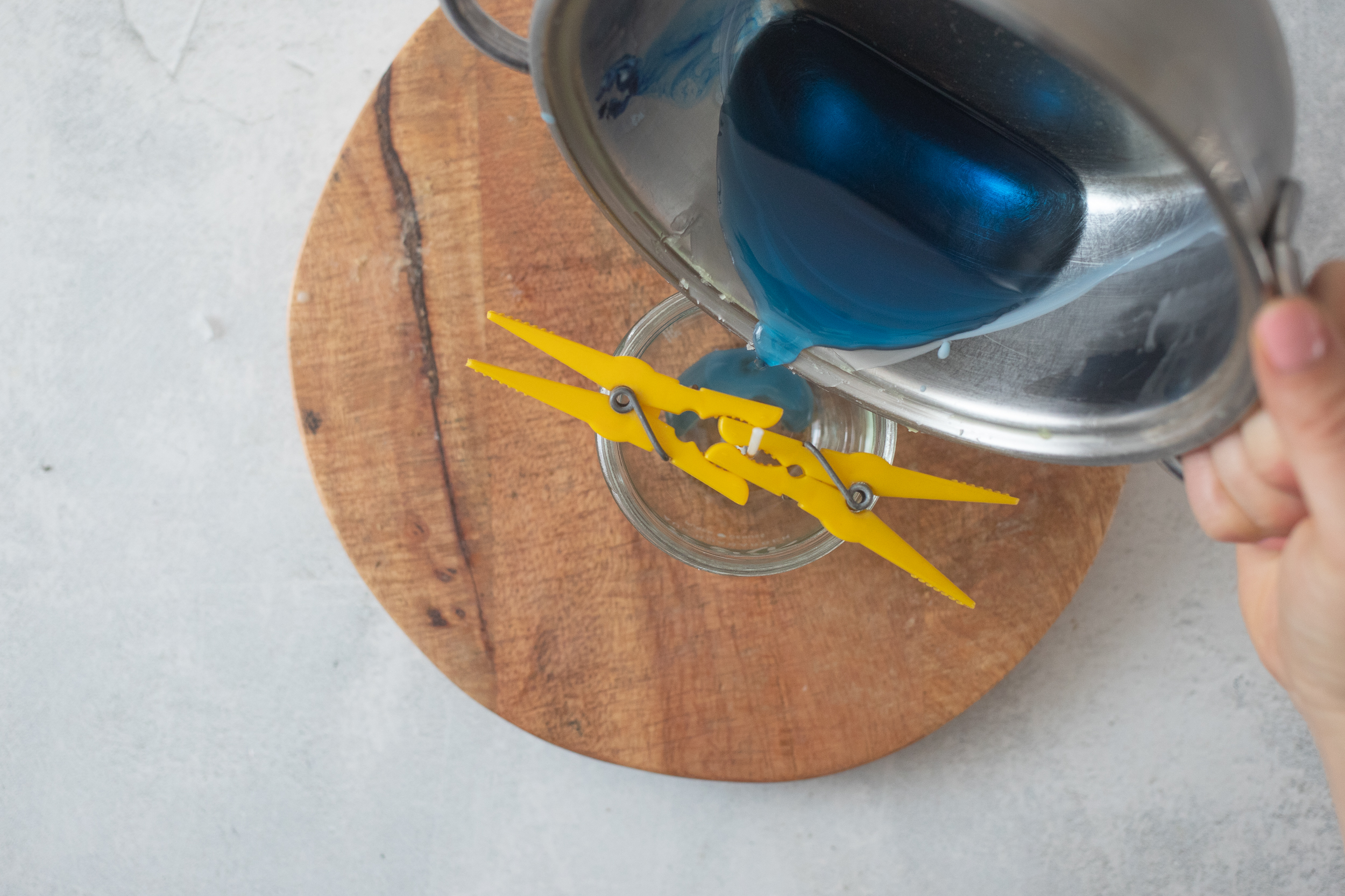 5. Im nächsten Schritt wird der Kerzendocht mittig im Marmeladenglas platziert. Du kannst ihn mit 2 Wäscheklammern fixieren, sodass er an Ort und Stelle bleibt und nicht verrutscht.