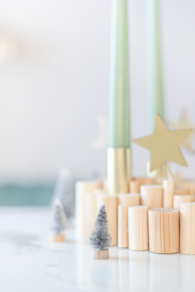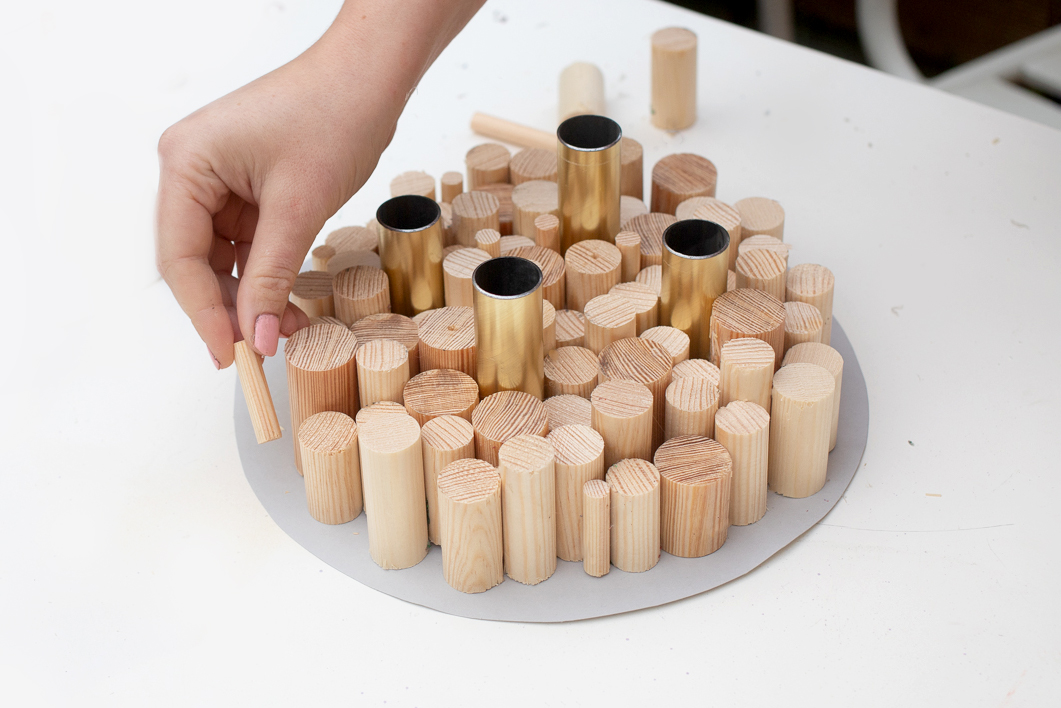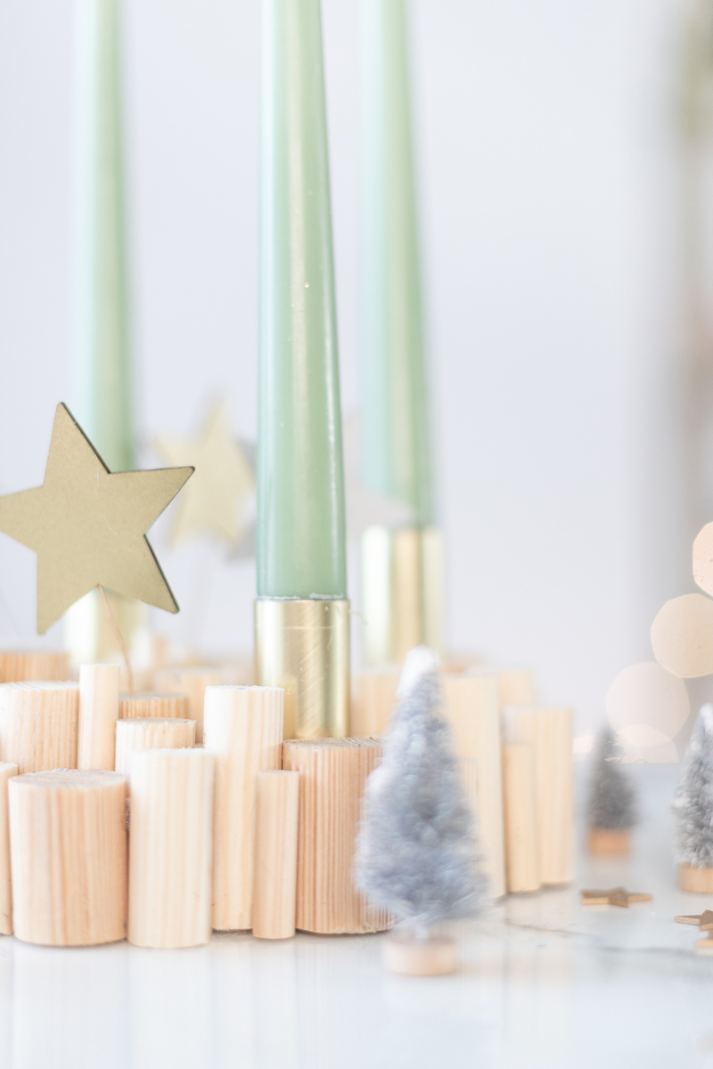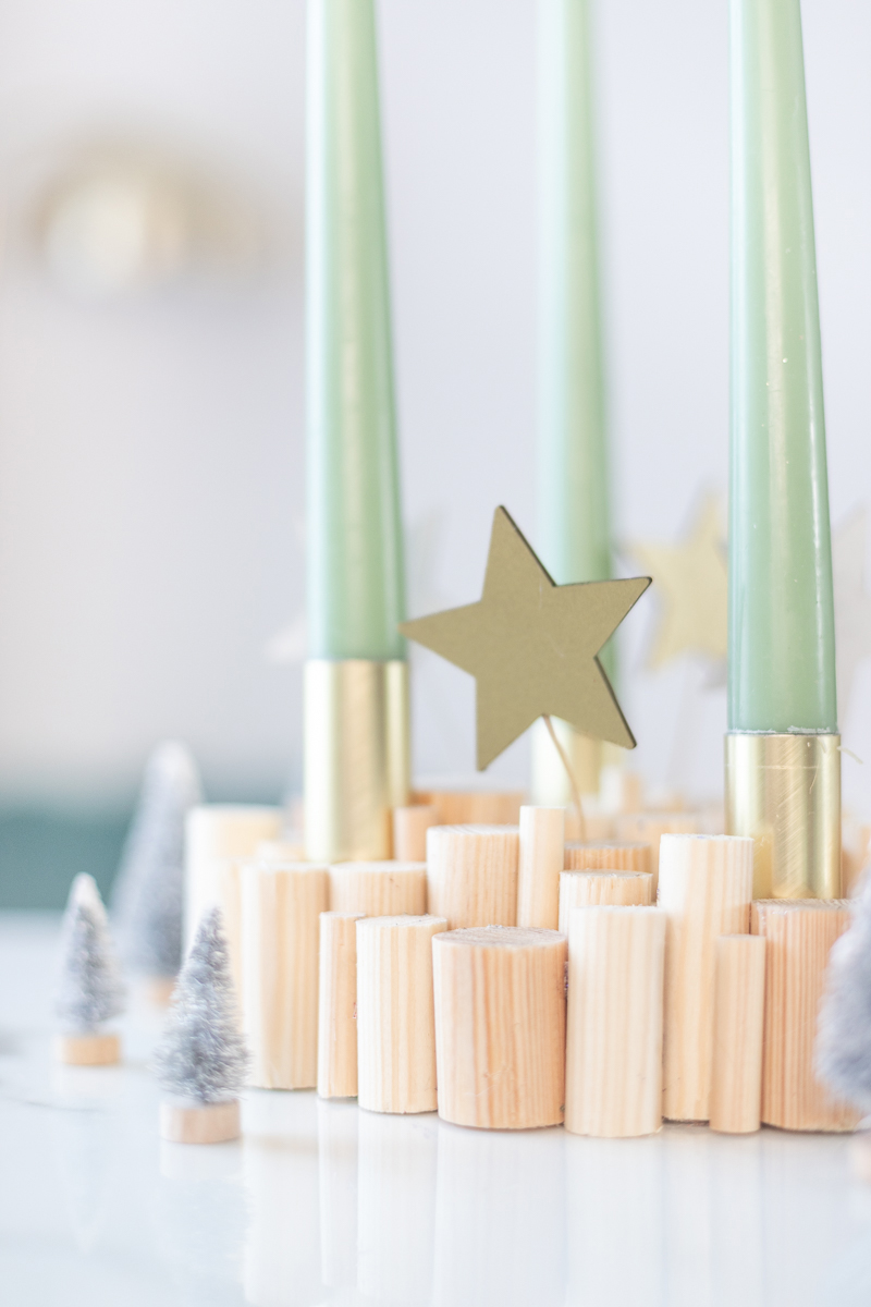Platziere die Stäbe nun kreuz und quer auf dem Kreis. Nutze einen Heißkleber oder Alleskleber, um die Stäbe zusammen zu fügen. Platziere dazwischen die Kerzenhalter. Achte darauf, alles gut zusammen zu drücken und keine Freiräume zu lassen. Lücken kannst du mit dünnen Stäben auffüllen.