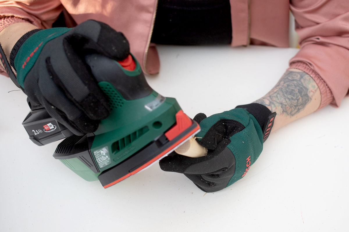 4. Wenn du alle Stäbe zugesägt hast, geht es ans Schleifen. Schleife die Ränder der Stäbe ab. Ich habe dafür die PSM 18 LI verwendet.
