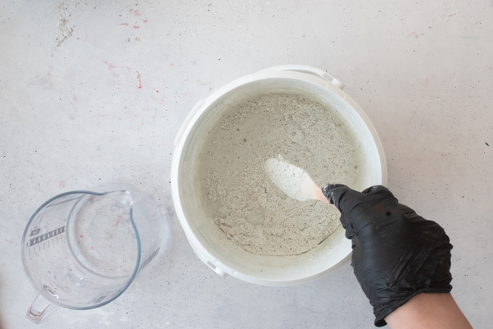 - ein Gefäß zum Anrühren (ich habe den leeren Beton-Eimer genutzt)