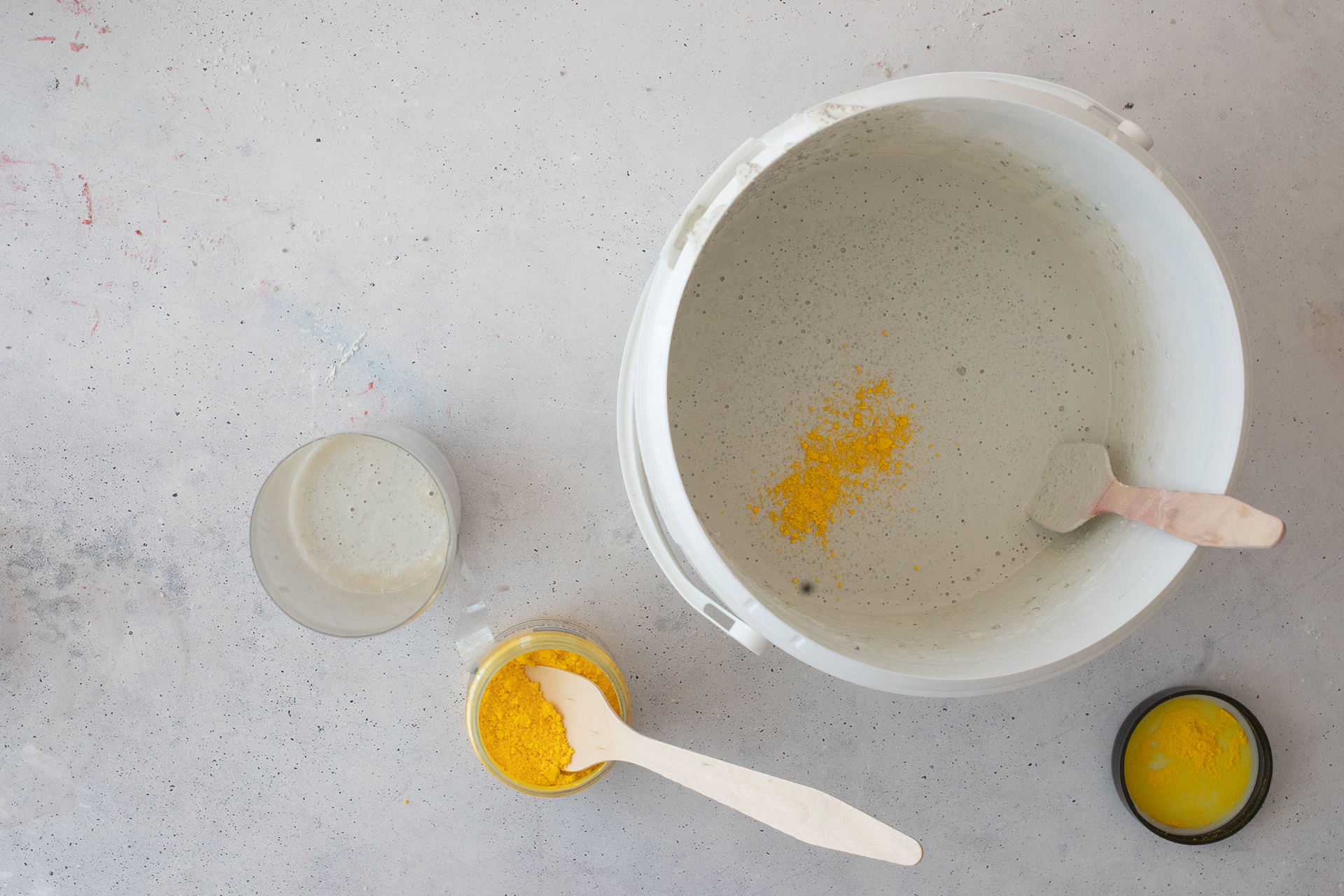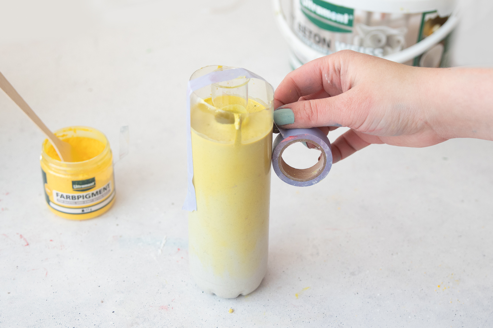 Außerdem haben wir beide jeweils Farbpigmente erhalten, und das ist besonders spannend: Diese kann man nämlich unter den weißen Beton mischen und dieser nimmt dann die Farbe an, je nachdem, wie viel man dazu gibt. Und so war auch direkt meine DIY-Idee geboren: