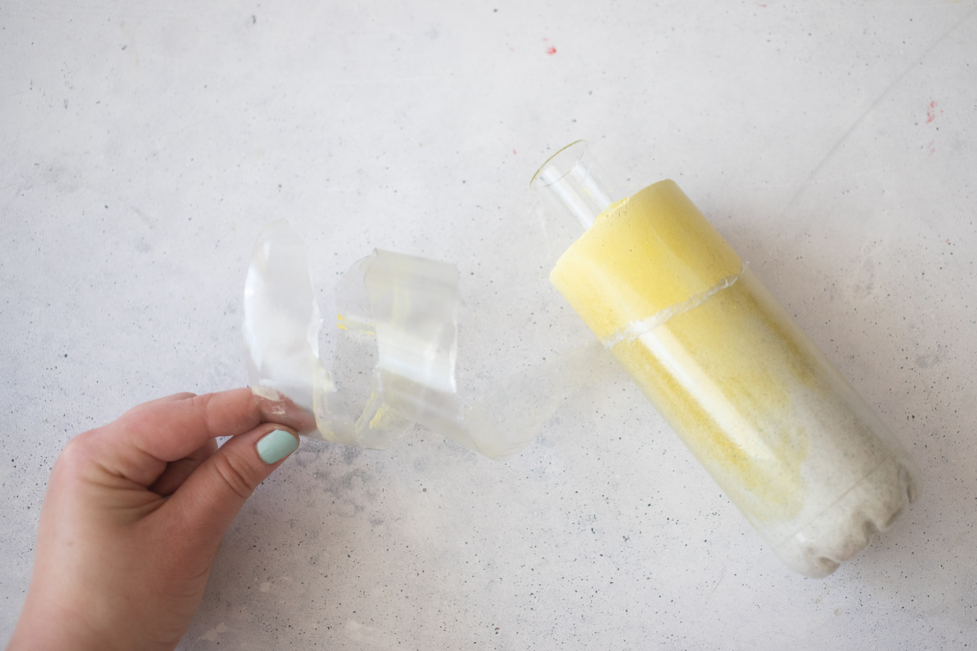 Um die Vase aus der Form zu holen, einfach die Flasche schräg einschneiden, und das Plastik rundherum abziehen.