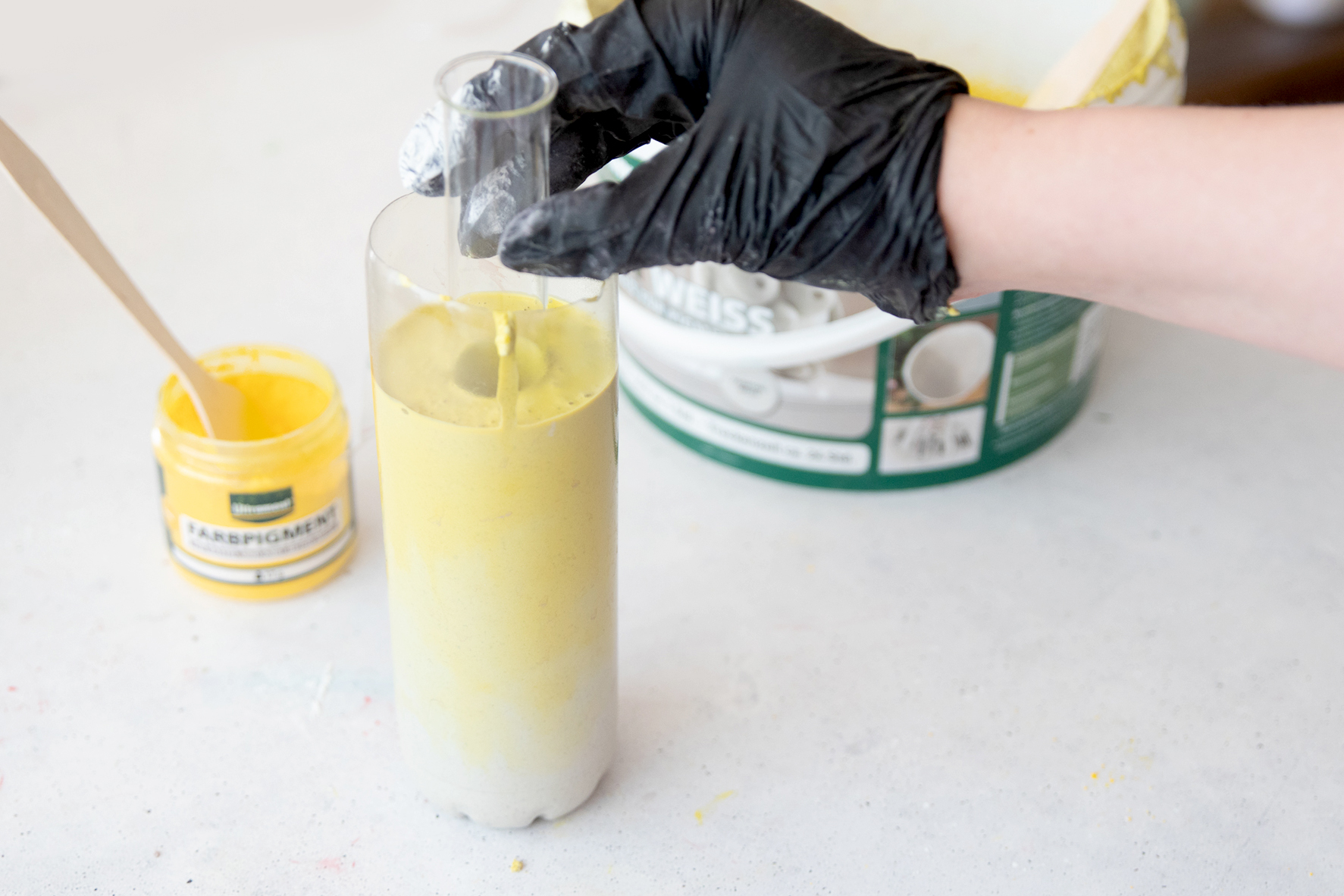 4. Dann geht es weiter mit den Pigmenten: Die rührst du nun nach und nach in den flüssigen Beton in deinem Gefäß zum Anrühren ein (nicht direkt in die Flasche geben). Erst nimmst du nur ein wenig Pigment und rührst es ein. Dann nimmst du die Masse mit dem Pigment und träufelst sie in die Mitte deiner Flasche. Achte darauf, gut zu zielen, damit nichts am Rand hängen bleibt.