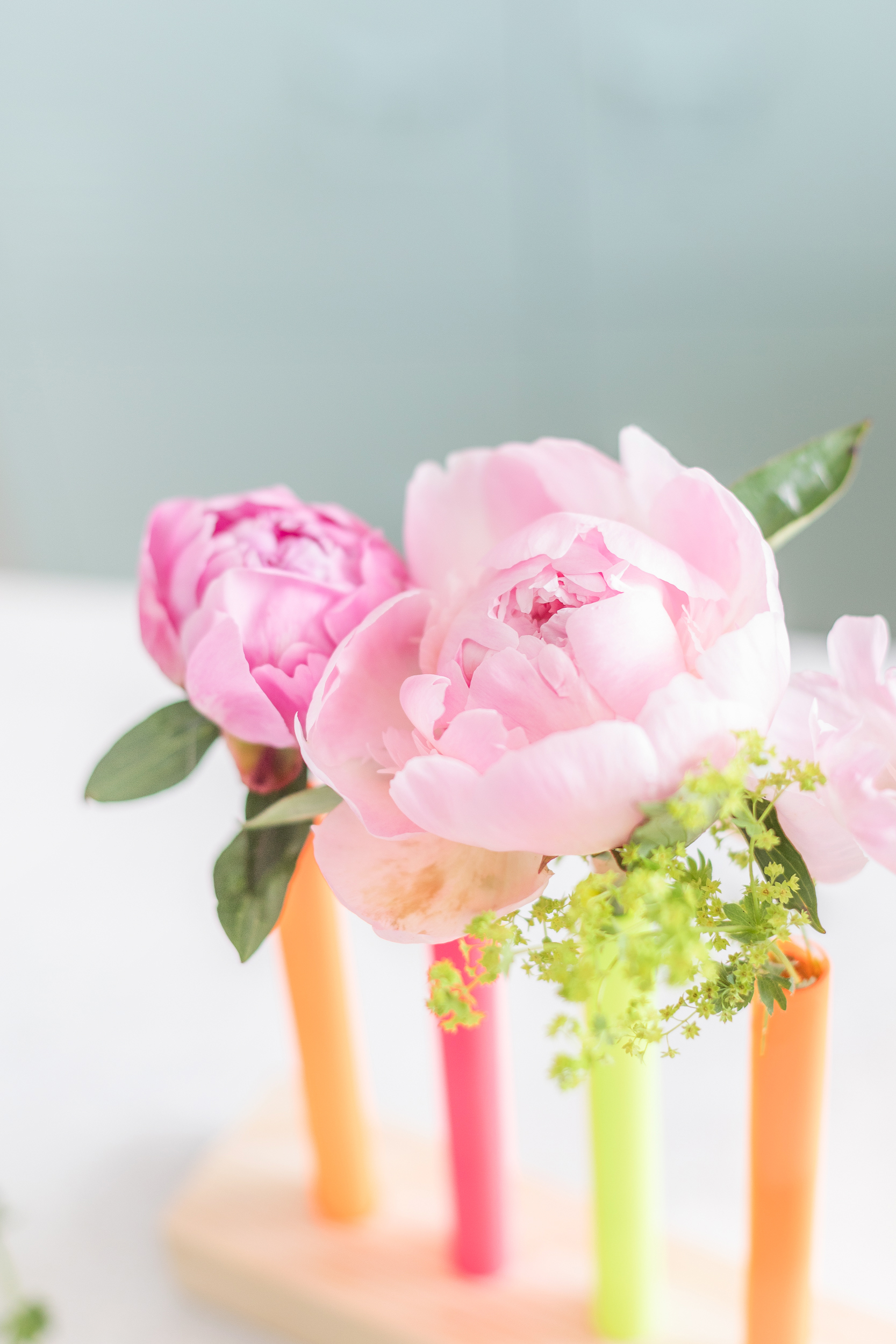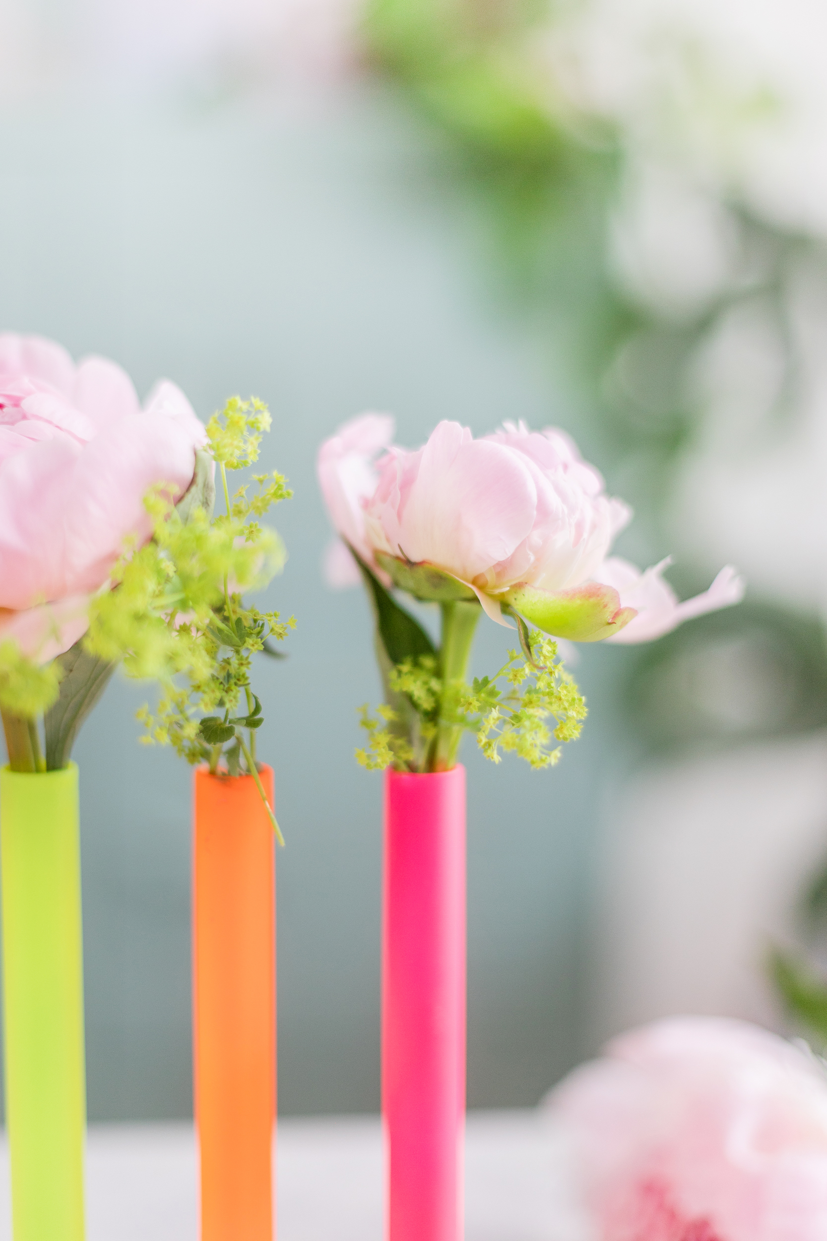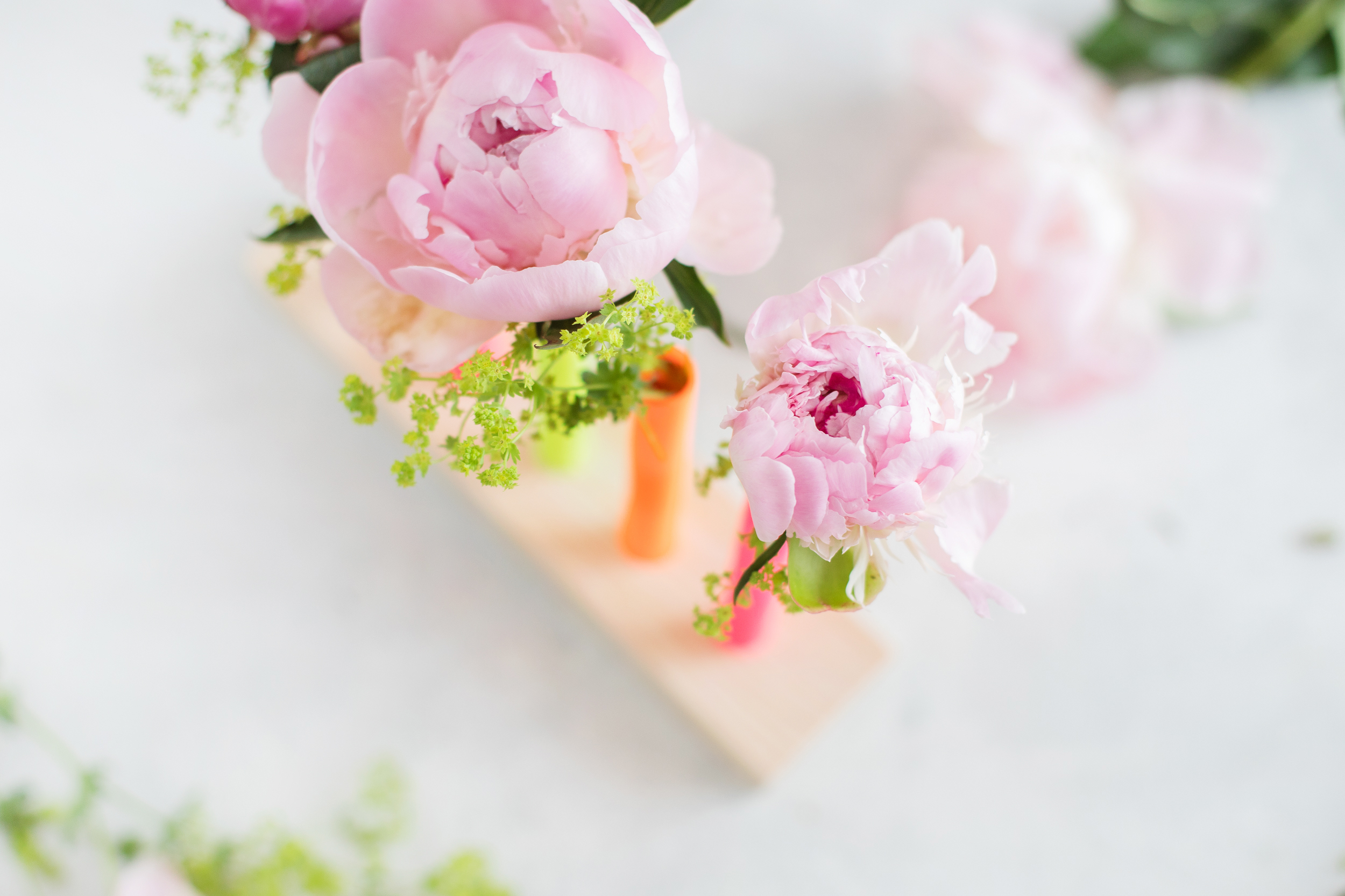 Yay, nun geht es ans Dekorieren! Ich finde, dass zarte Farben wie die rosa Pfingstrosen wunderbar mit den Neonfarben harmonieren.