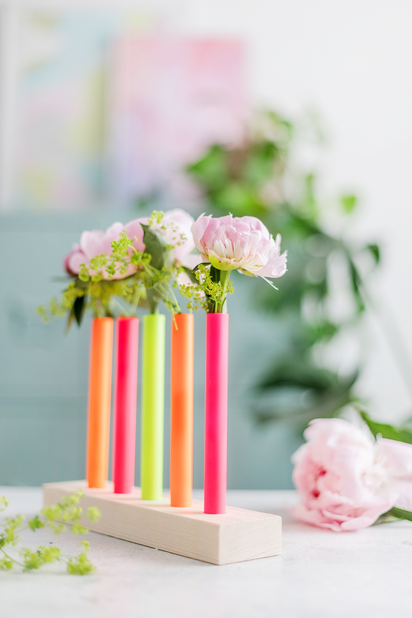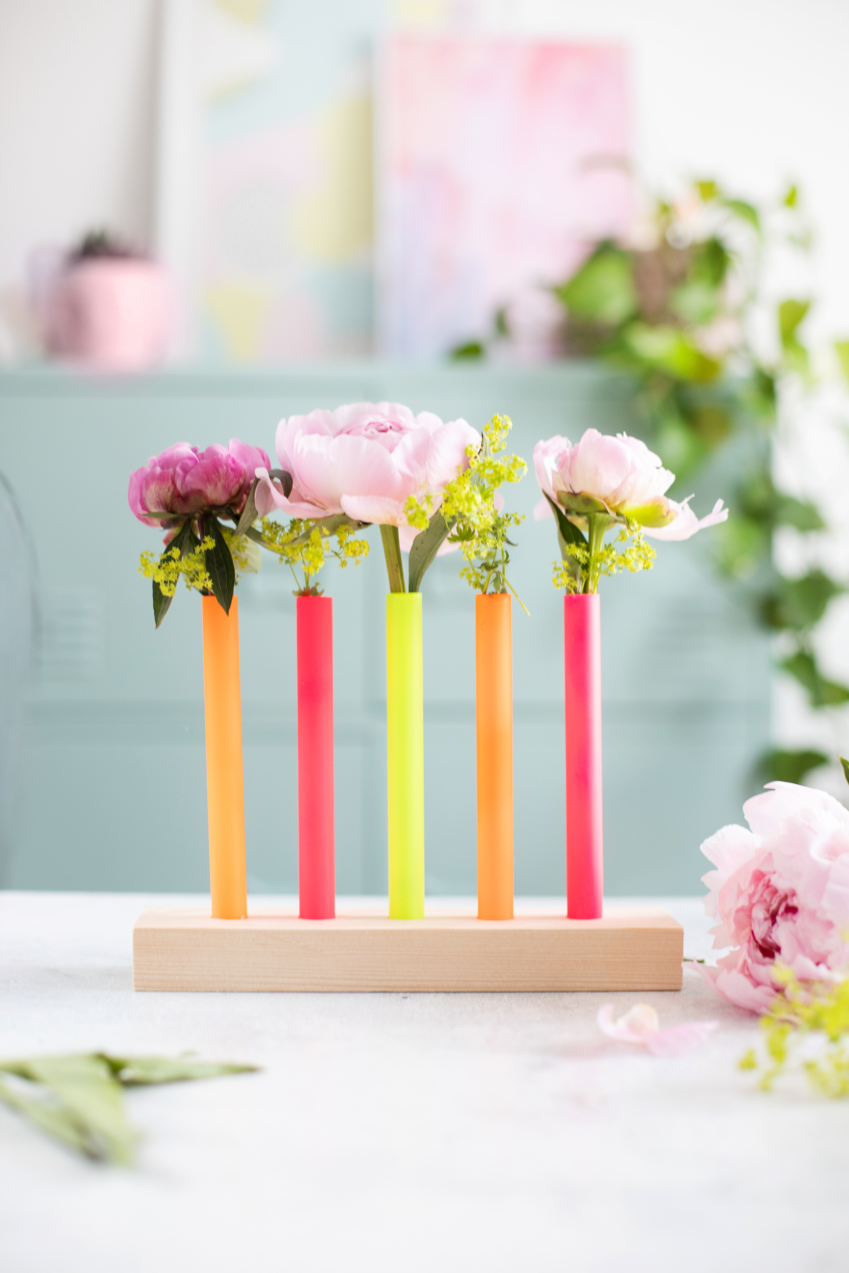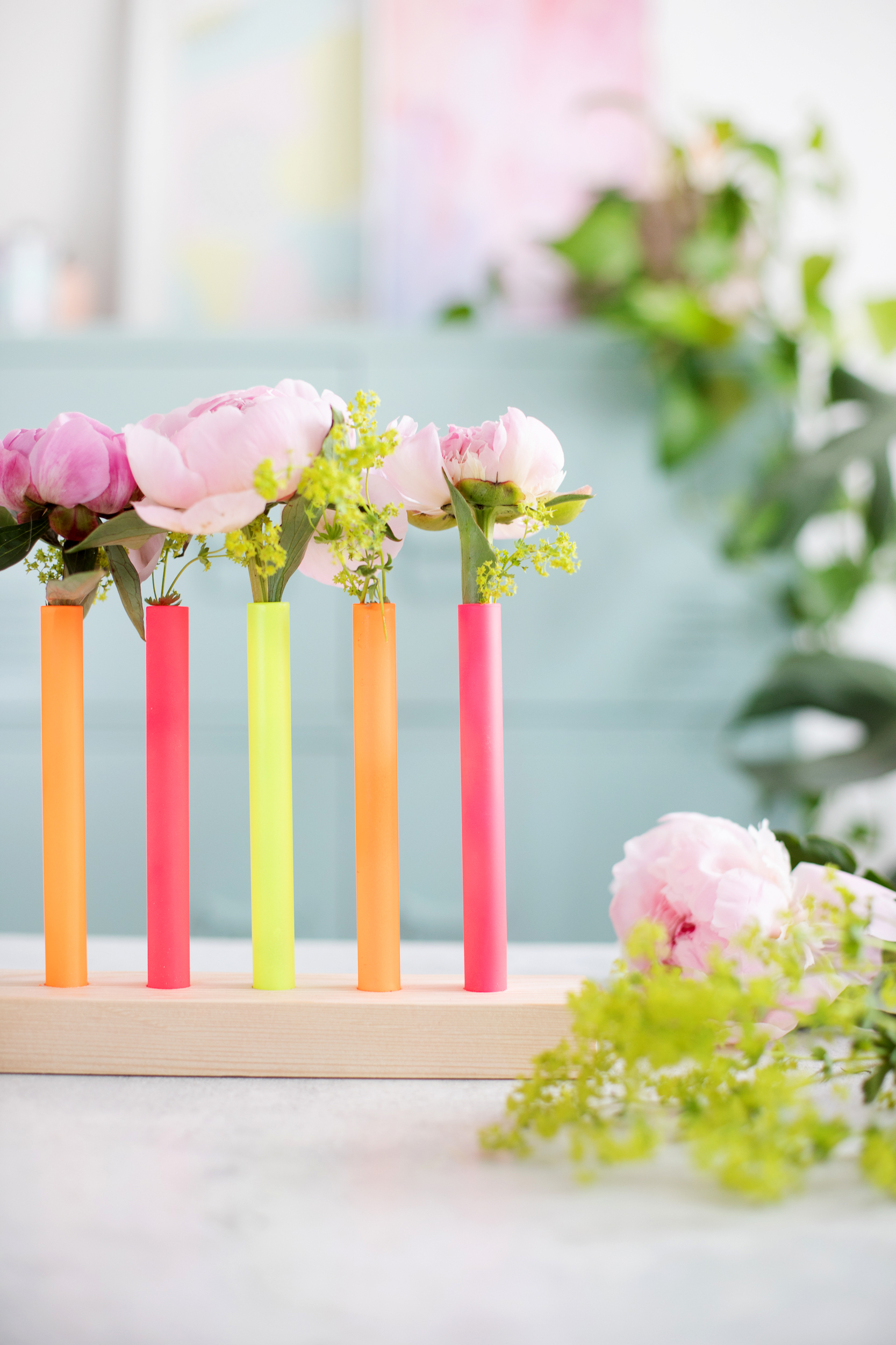 So geht’s: DIY Blumenvasen aus Reagenzgläsern in Neonfarben