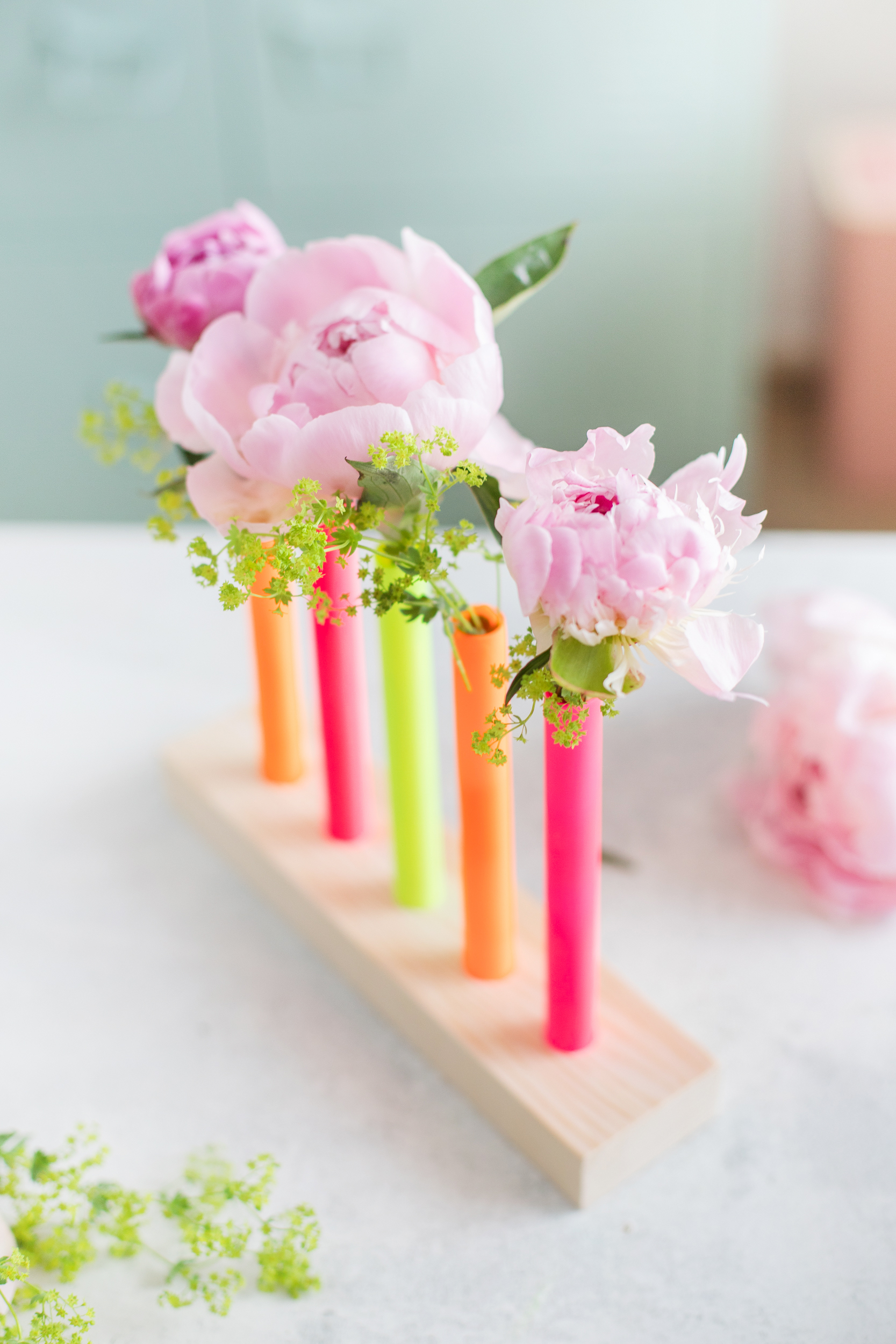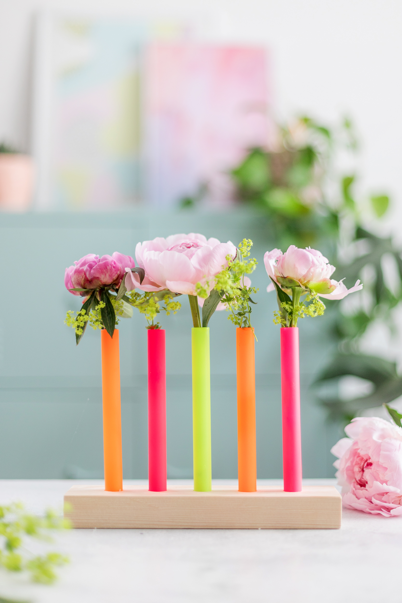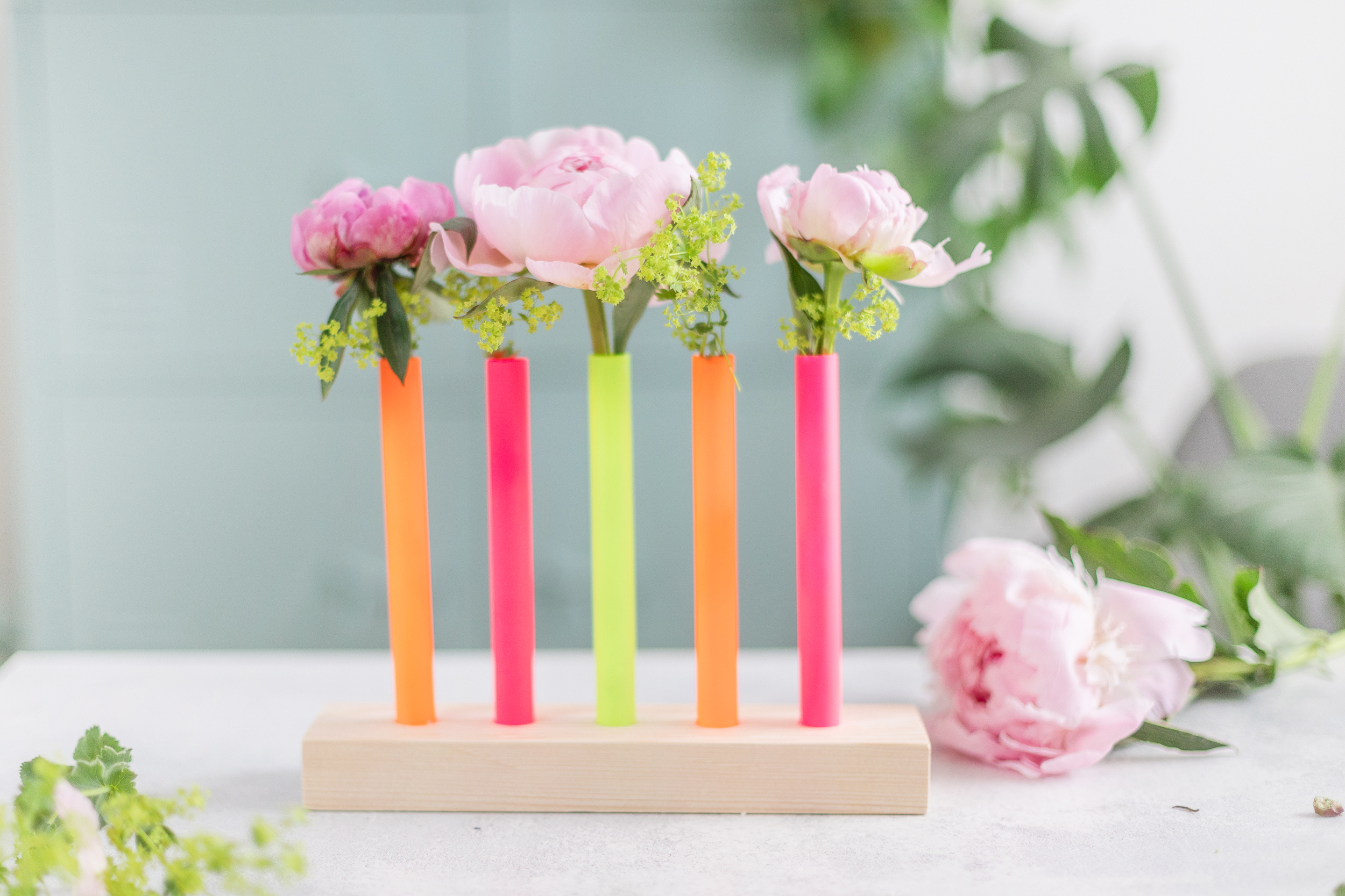 So geht’s: DIY Blumenvasen aus Reagenzgläsern in Neonfarben