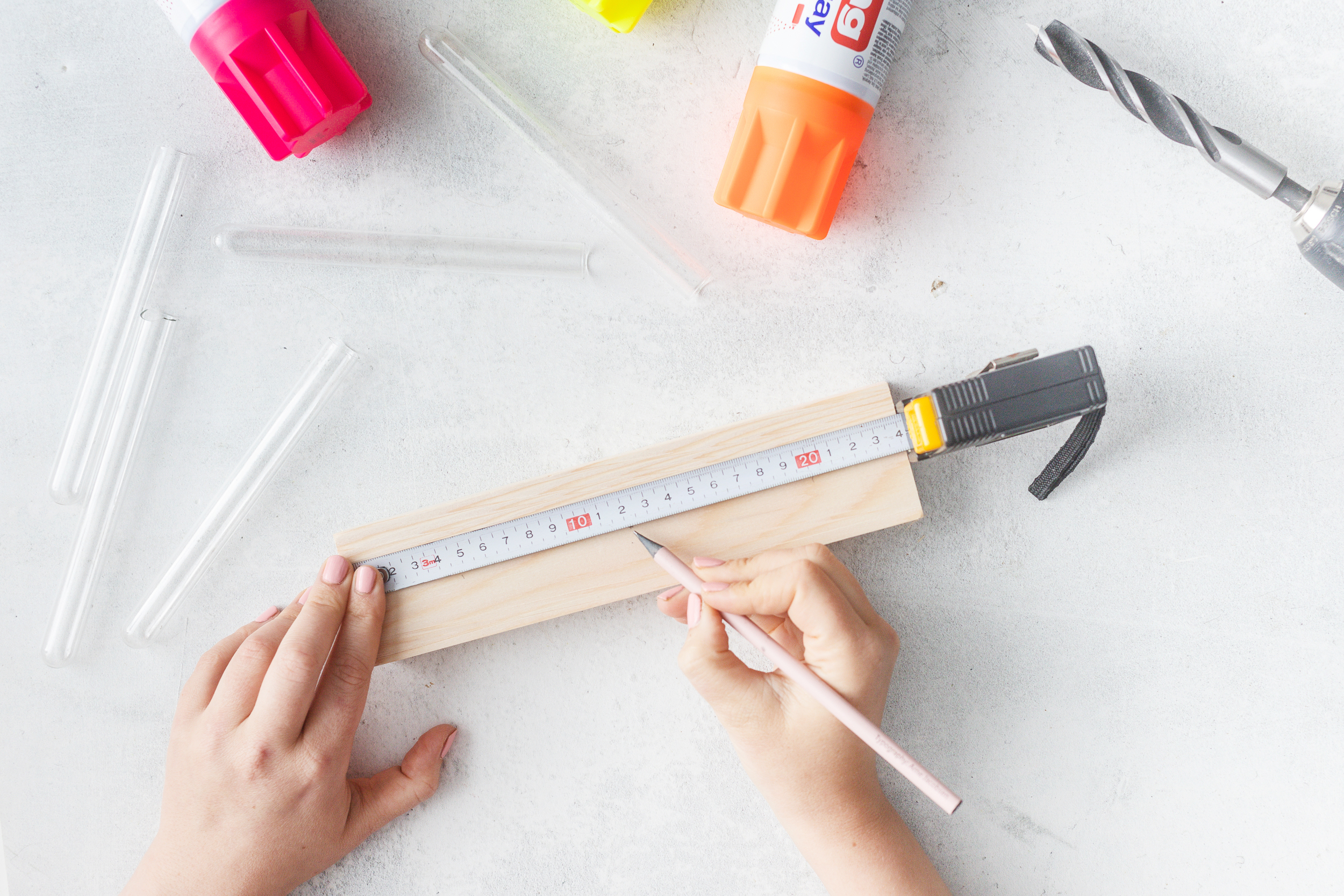 1. Im ersten Schritt misst du die Abstände auf dem Holz aus. Da ich fünf Vasen anbringen möchte, teile ich die Länge des Holzes (24 cm) durch 6 – und mache mir Markierungen im Abstand von 4 Zentimetern.