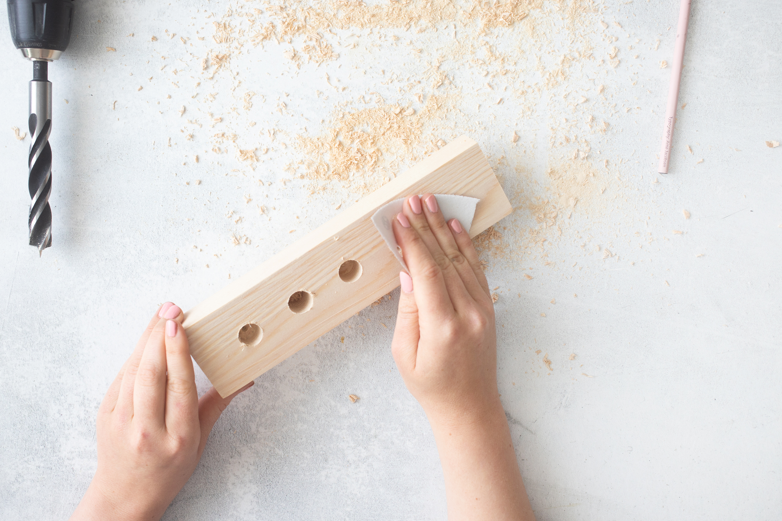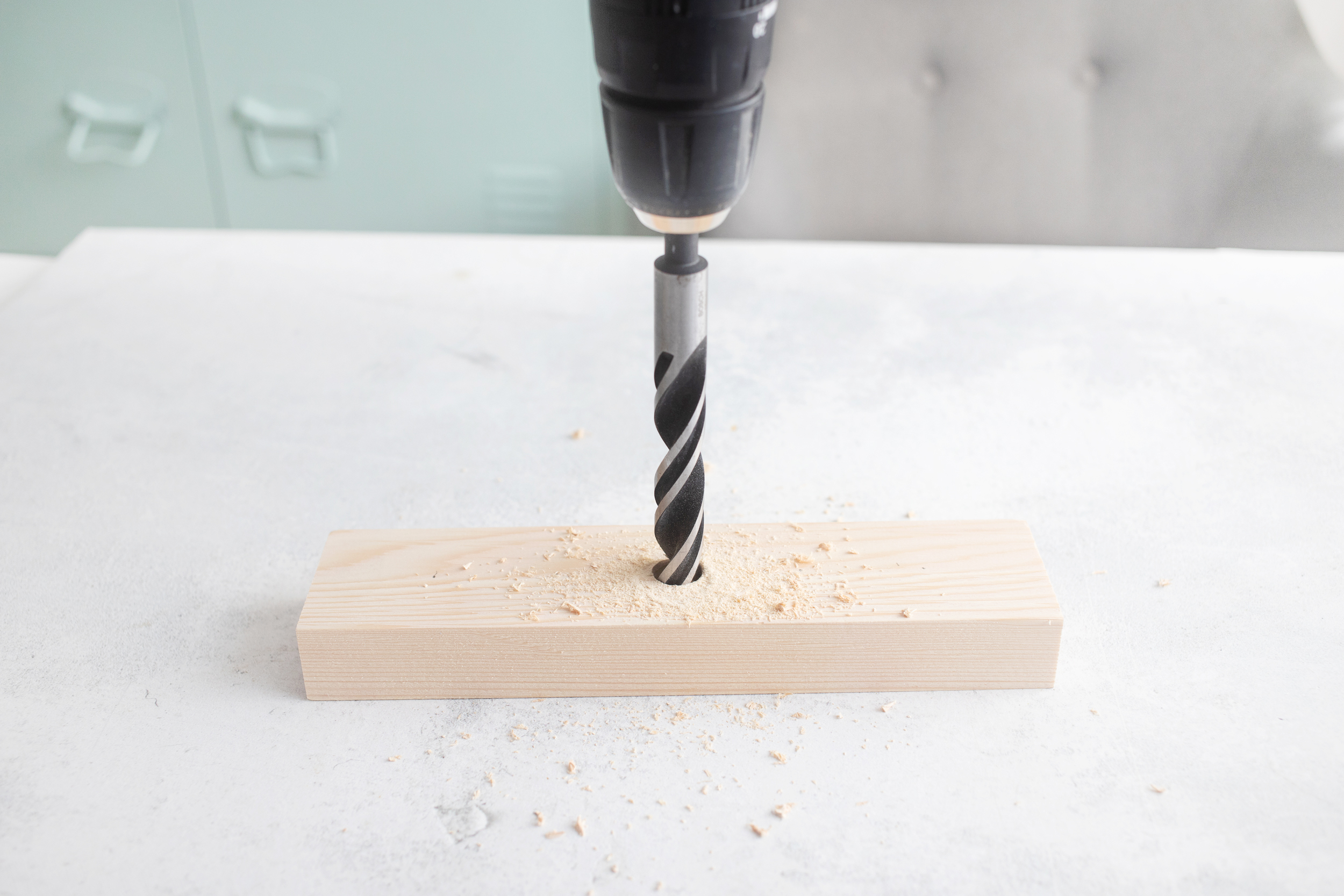 2. Nun brauchst du den Bohraufsatz, der den gleichen Durchmesser hat wie deine Reagenzgläser. Bohre in das Kantholz – so tief, dass die Reagenzgläser Halt haben, aber nicht komplett durch das Holz durch.