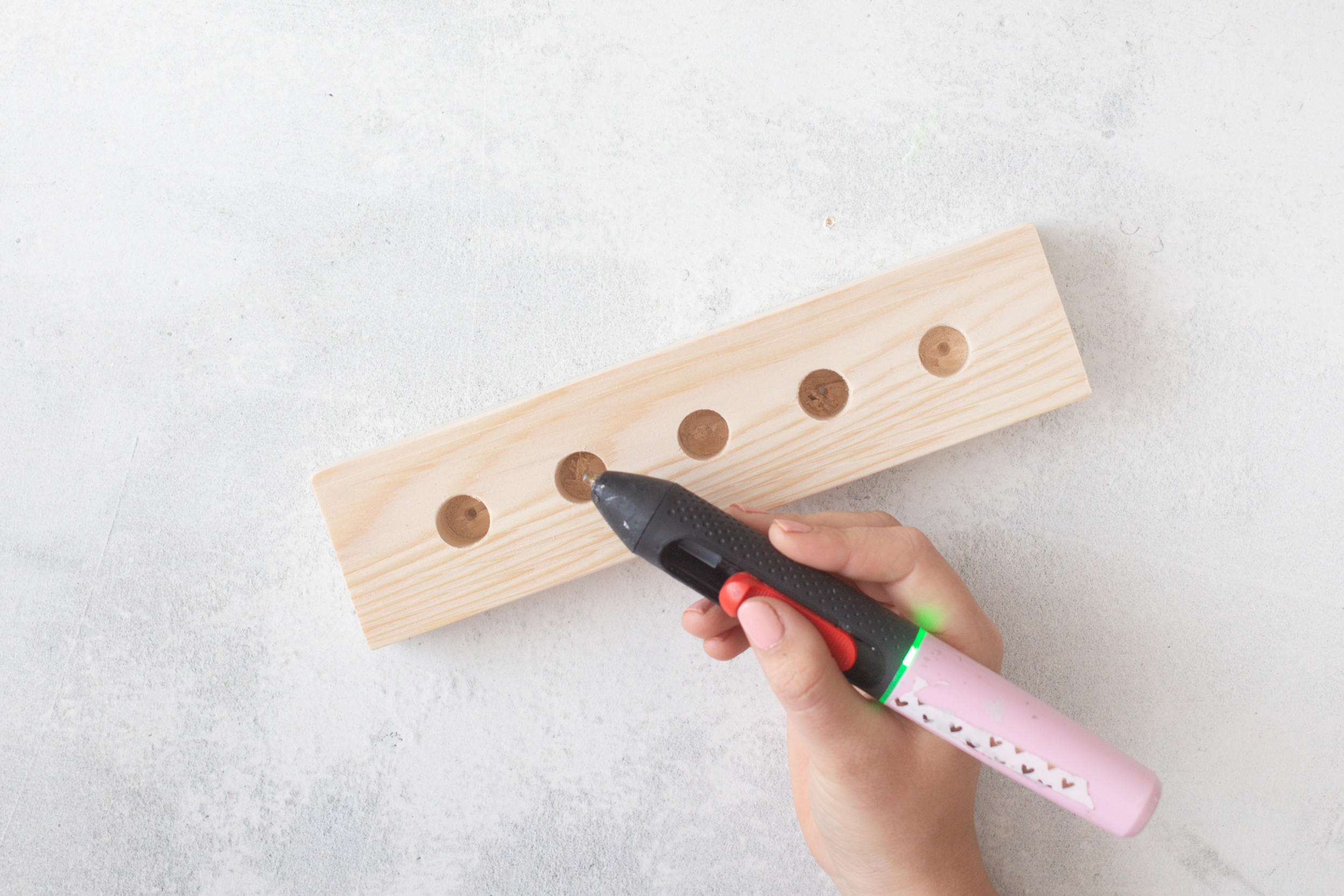 5. Fast fertig: Gib nun etwas Heißkleber in die gebohrten Löcher.