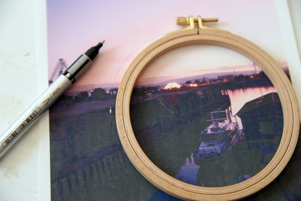 2. Nun legt ihr euren Stickrahmen auf euer ausgedrucktes Foto und zeichnet einen Kreis auf das Foto – mit etwa einem Zentimeter Abstand zum Rahmen. Schneidet dann das Foto kreisrund aus.