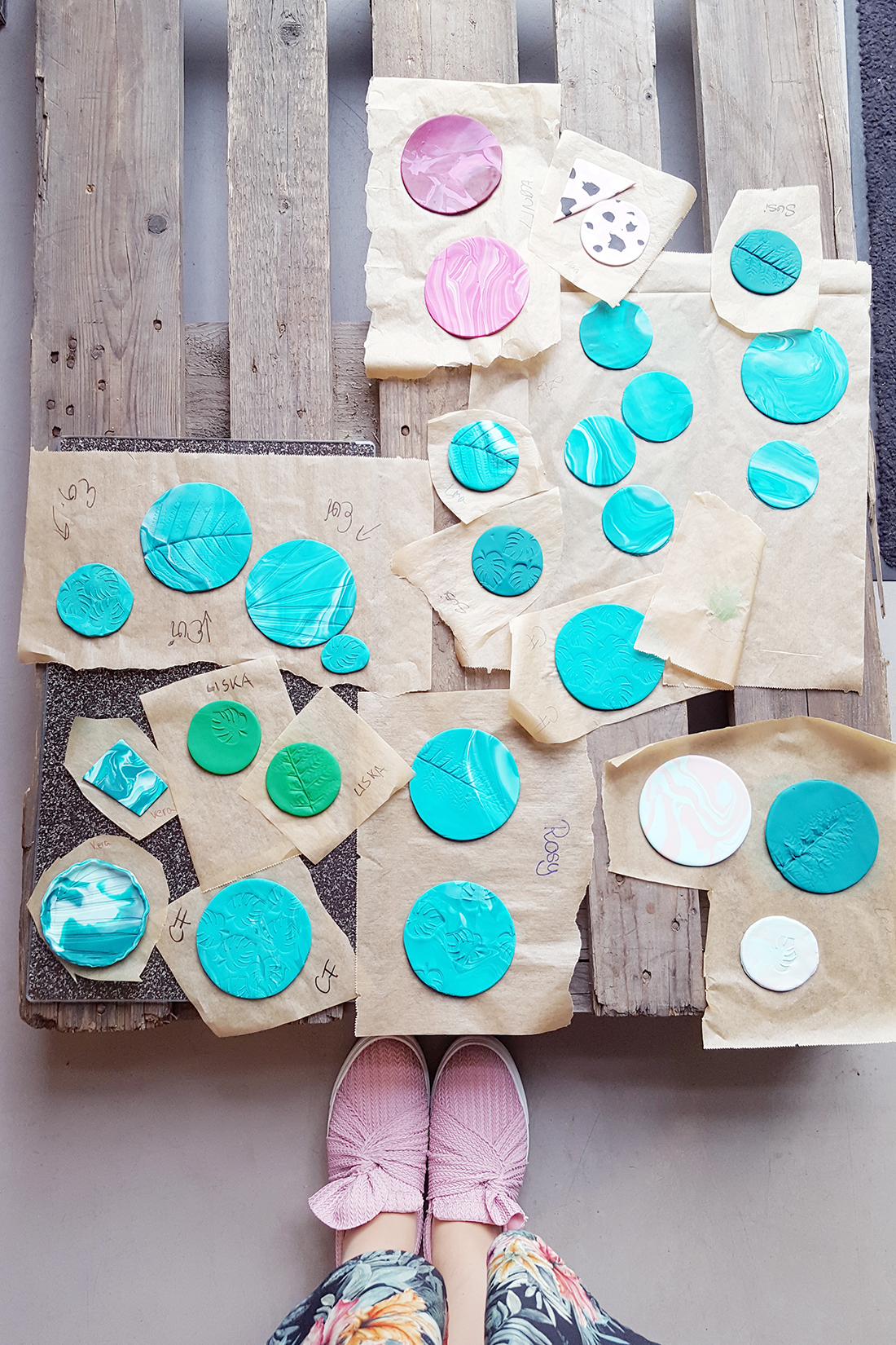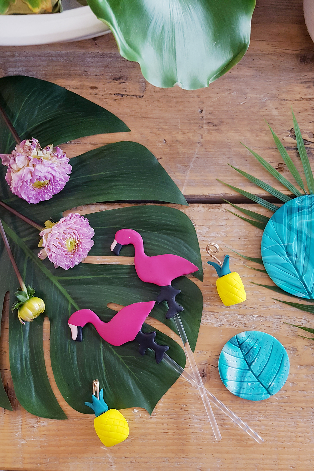 Das Konzept rund um den Workshop war „Tropical Fimo“ – wir sind mit einem Brunch in der Rösttrommel mit viel tropischer Deko in den Tag gestartet und haben viel über die Geschichte und Anwendungsbereiche von Fimo erfahren. Im Anschluss habe ich zwei DIYs vorgestellt – nämlich stylische Flamingo-Cocktailstäbchen und Blätter-Untersetzer, die ihr unten seht. Mich macht es total glücklich, einen Workshop zu leiten und zu sehen, wie jeder die DIYs ganz unterschiedlich interpretiert und im eigenen Stil umsetzt. Auf dem rechten Bild seht ihr einige tolle Ergebnisse, wie sie aus dem Ofen kamen. Ich hatte so, so viel Spaß!