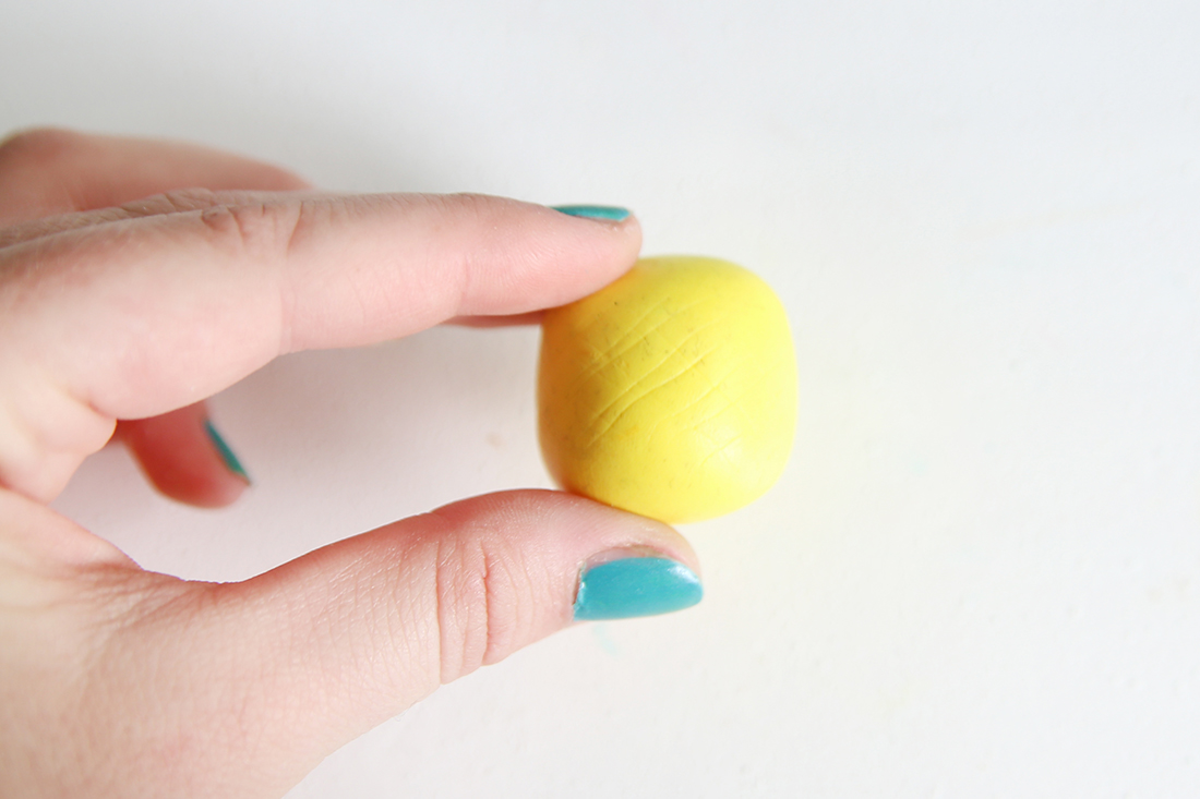 1. Nimm etwa die Hälfte des gelben Fimo-Blocks und forme daraus eine Kugel.