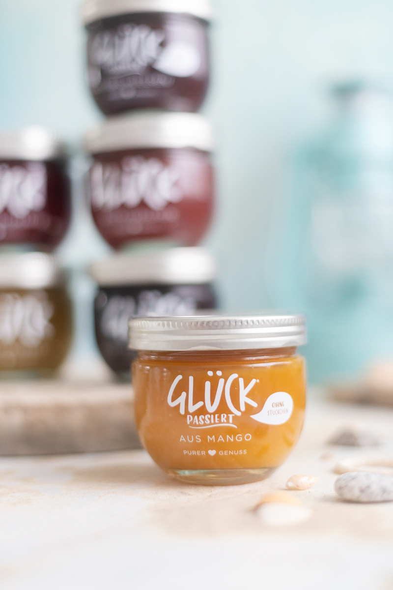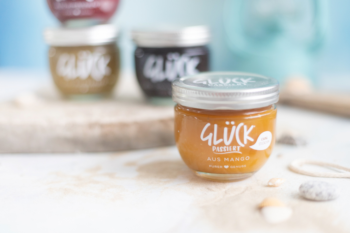 Die leckeren Marmeladen gibt es außerdem als „GLÜCK passiert“ Variante. Die „GLÜCK passiert“ Marmeladen sind ohne Kerne und Stückchen – perfekt für alle, die das lieber mögen.