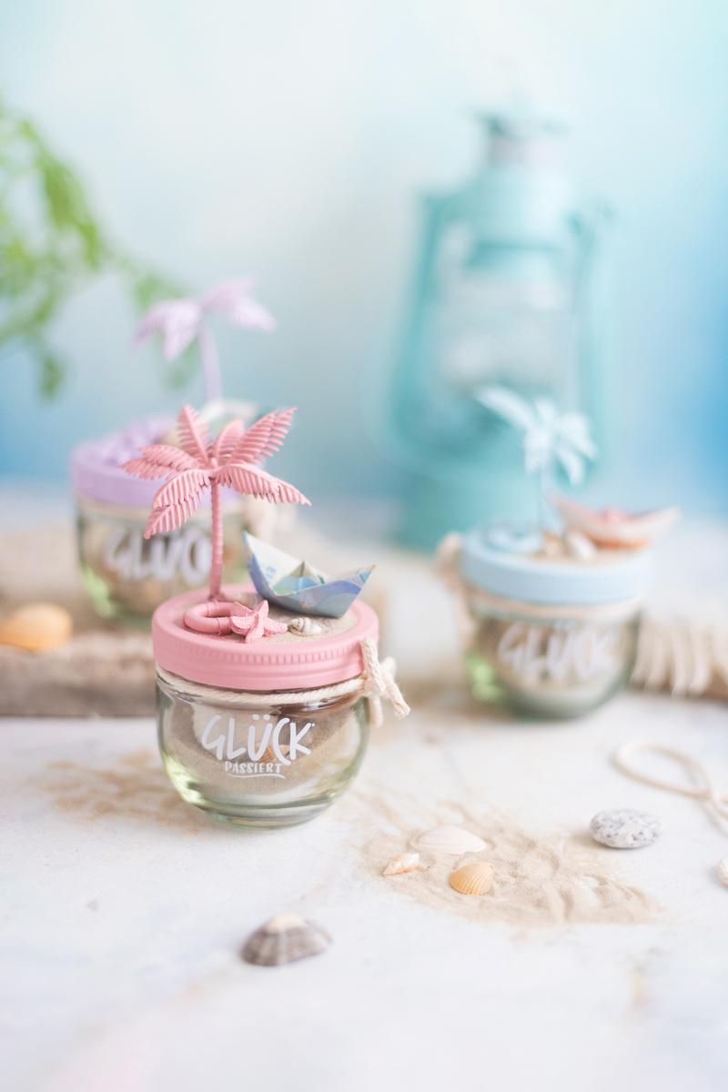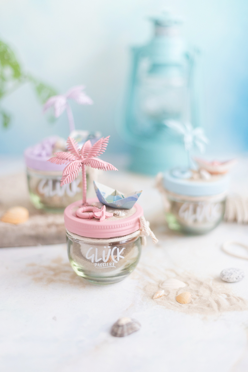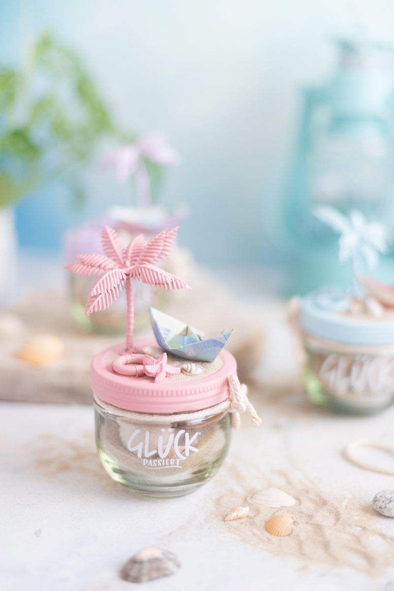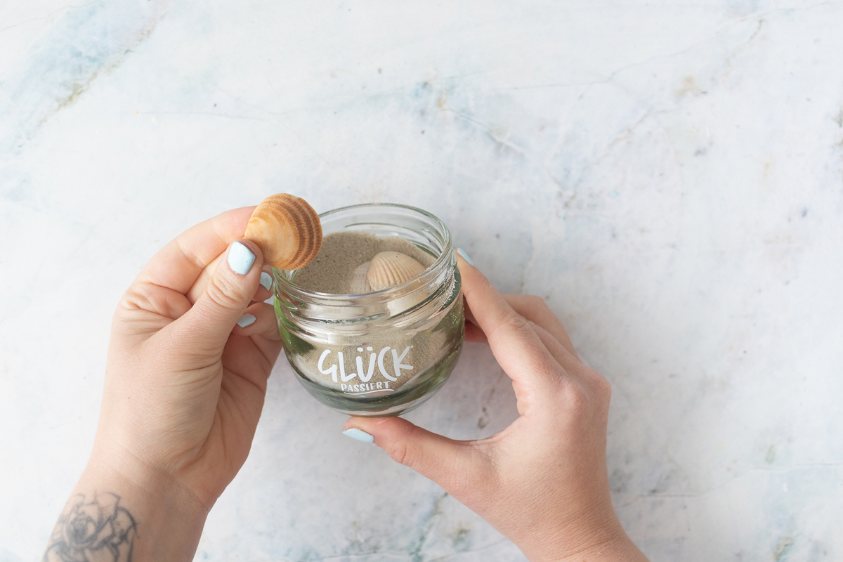5. Nun füllst du das GLÜCK-Glas mit etwas Sand und platzierst ein paar Muscheln darin – passend zum Urlaubsthema.