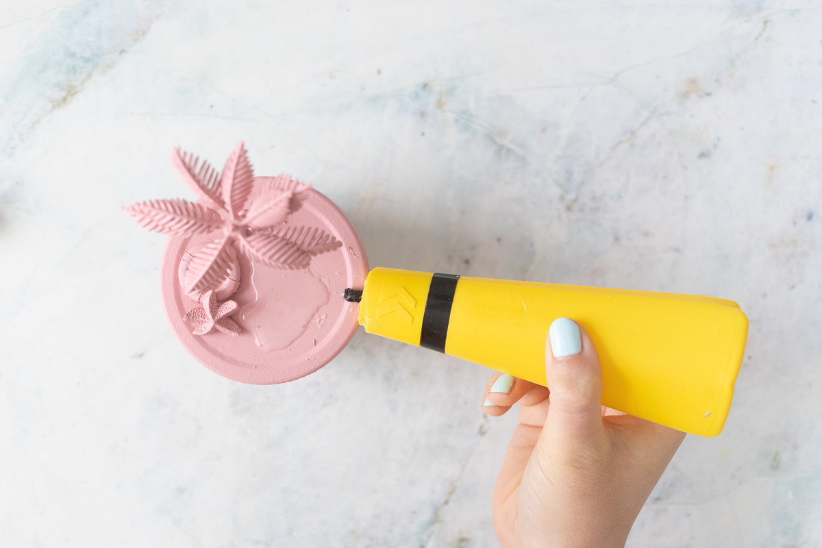 7. Nimm nun den Bastelkleber zur Hand und verteile ihn flächig auf dem angesprühten Deckel.