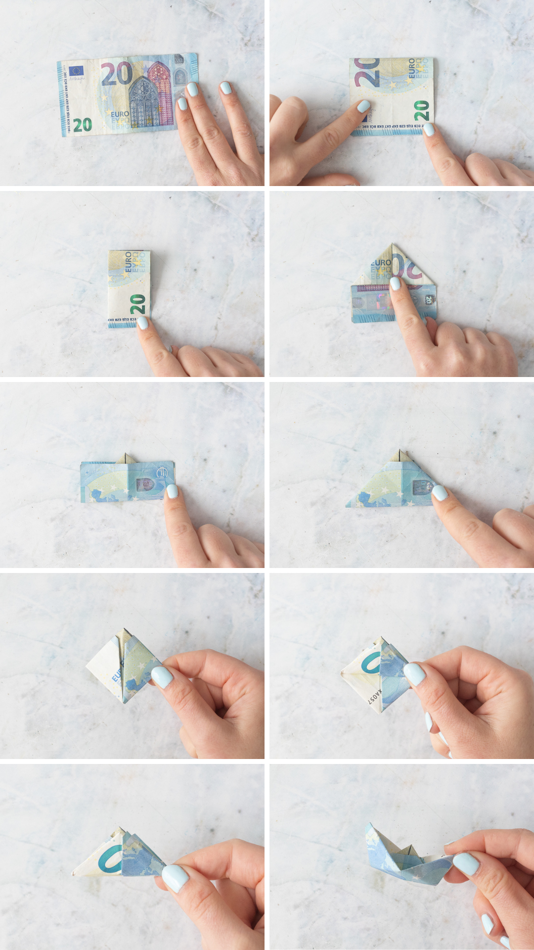 Damit ist das Glas fertig – im nächsten Schritt geht es ans Geldschein falten für dein Geldgeschenk. Der Geldschein wird in der Form eines Bootes gefaltet.