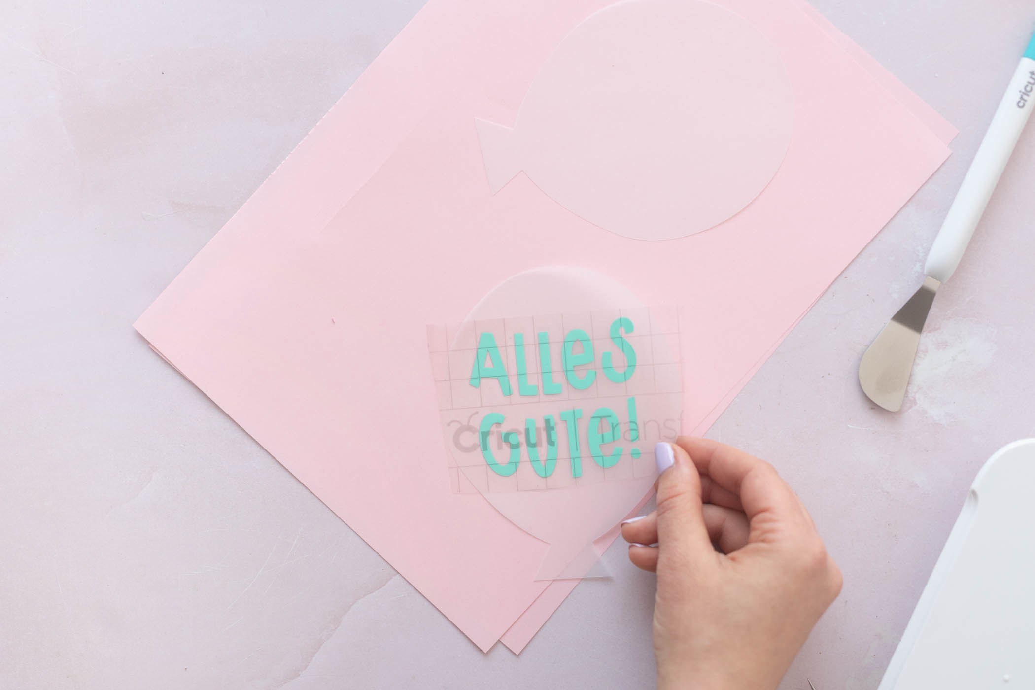 Als nächstes überträgst du den Schriftzug auf den Ballon. Nutze dafür Transferfolie oder Transfertape. Mit der Rakel wird die Transferfolie zuerst auf dem Schriftzug angebracht. Dieser lässt sich dadurch gut von der Trägerfolie lösen und auf dem Ballon platzieren.