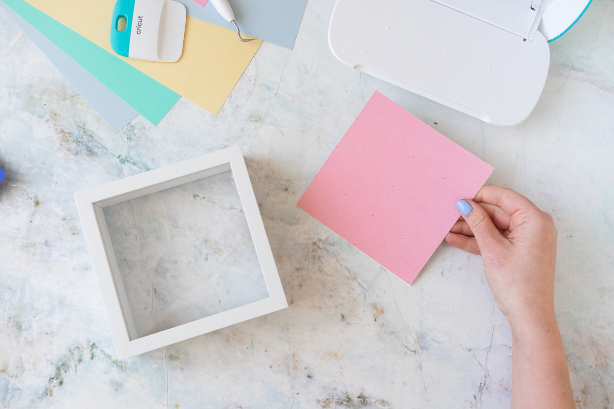 1. Im ersten Schritt schneidest du das Smart Sticker Paper in der Größe der Einlegepappe deines Bilderrahmens zu. Ziehe dann die Trägerfolie des Smart Sticker Papers hinten ab und klebe es auf die Einlegepappe des Bilderrahmens.