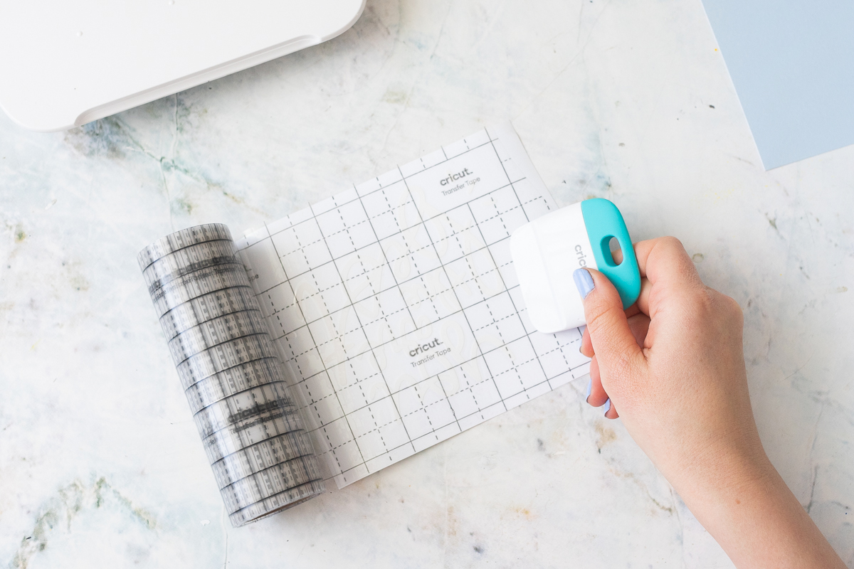 7. Platziere nun das Transferklebeband glatt auf dem Schriftzug. Streiche mit der Rakel mit etwas Druck über das Motiv, sodass es gut am Transferklebeband haftet.