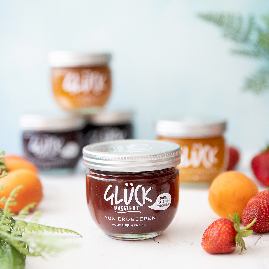 Die Marmeladen gibt es außerdem als „GLÜCK passiert“ Variante – ohne Kerne und Stückchen. Diese gibt es in den Geschmacksrichtungen Mango, Erdbeere, Schwarzkirsche, Aprikose, Himbeere, Holunder und Brombeere.