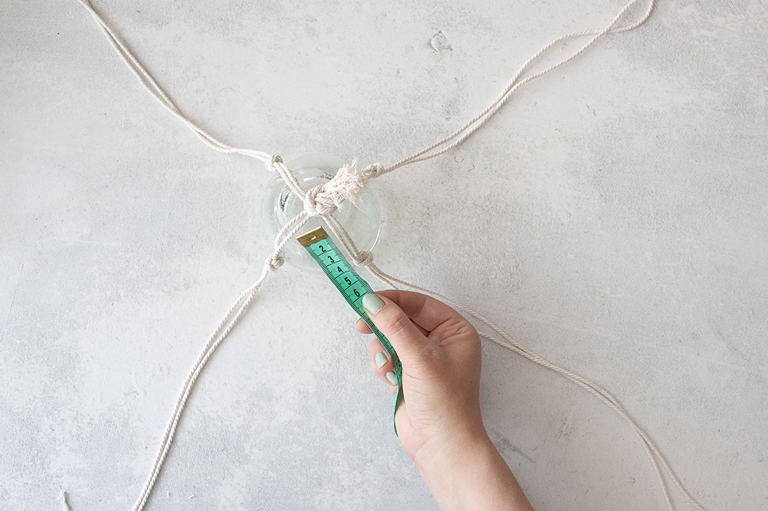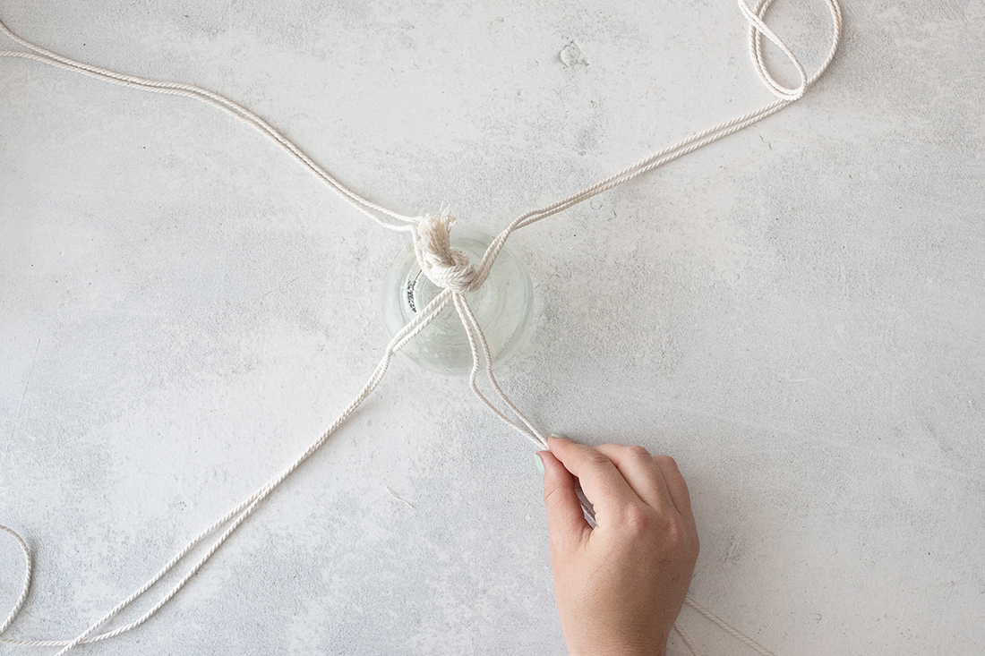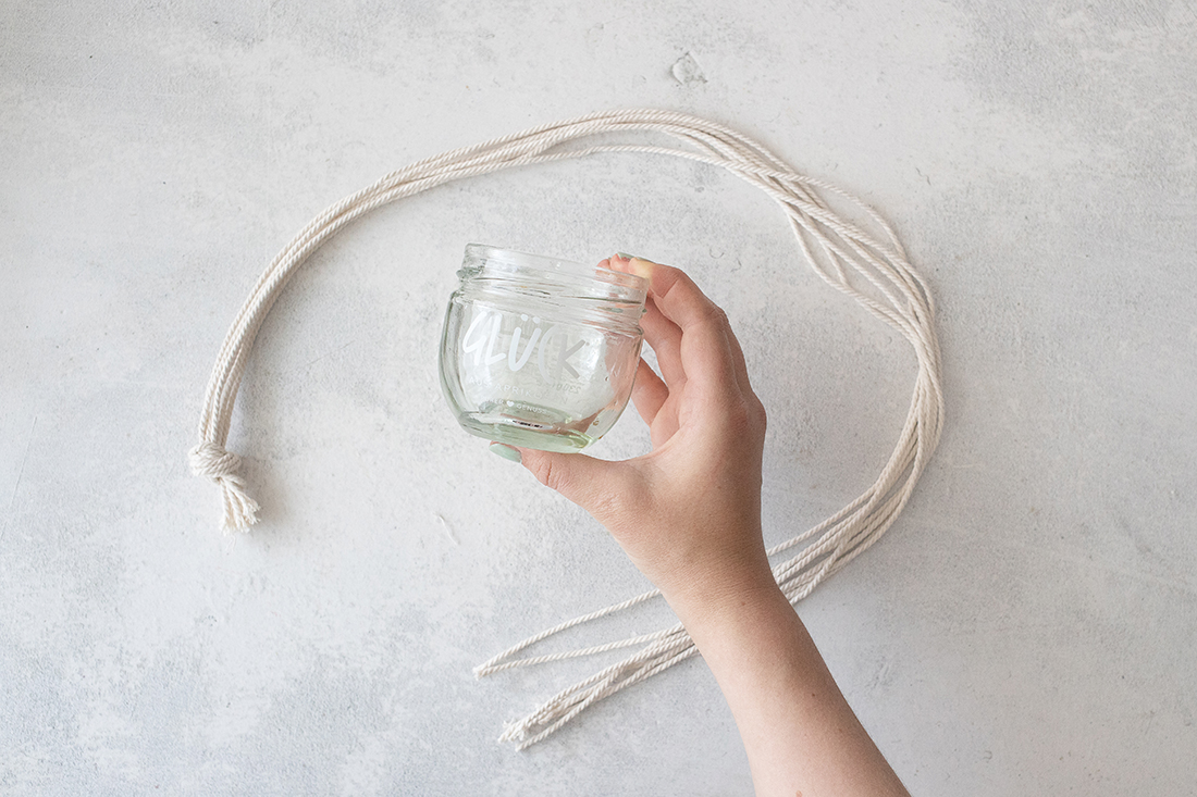 2. Drehe das (saubere) Marmeladenglas so, dass der Boden oben ist. Nun legst du das Makramee-Garn so darauf, dass der große Knoten mittig auf dem Glas-Boden ist. Lege nun immer zwei Stränge zusammen, sodass du nun vier Doppelstränge hast.