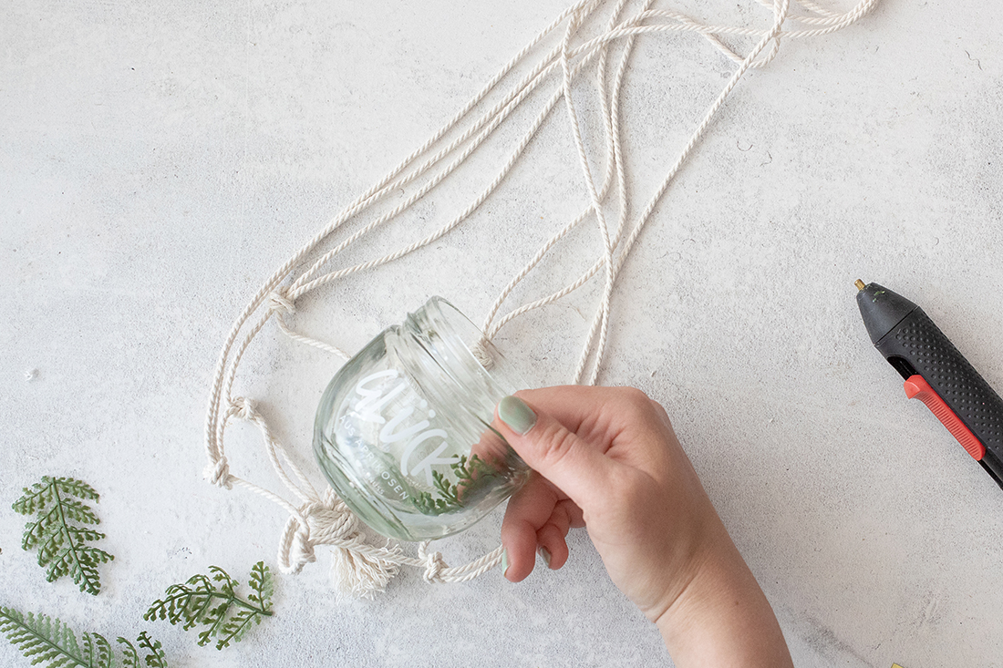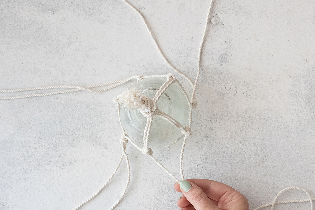 Nun kannst du oben noch einen Knoten aus allen Strängen machen, um das Windlicht aufzuhängen.