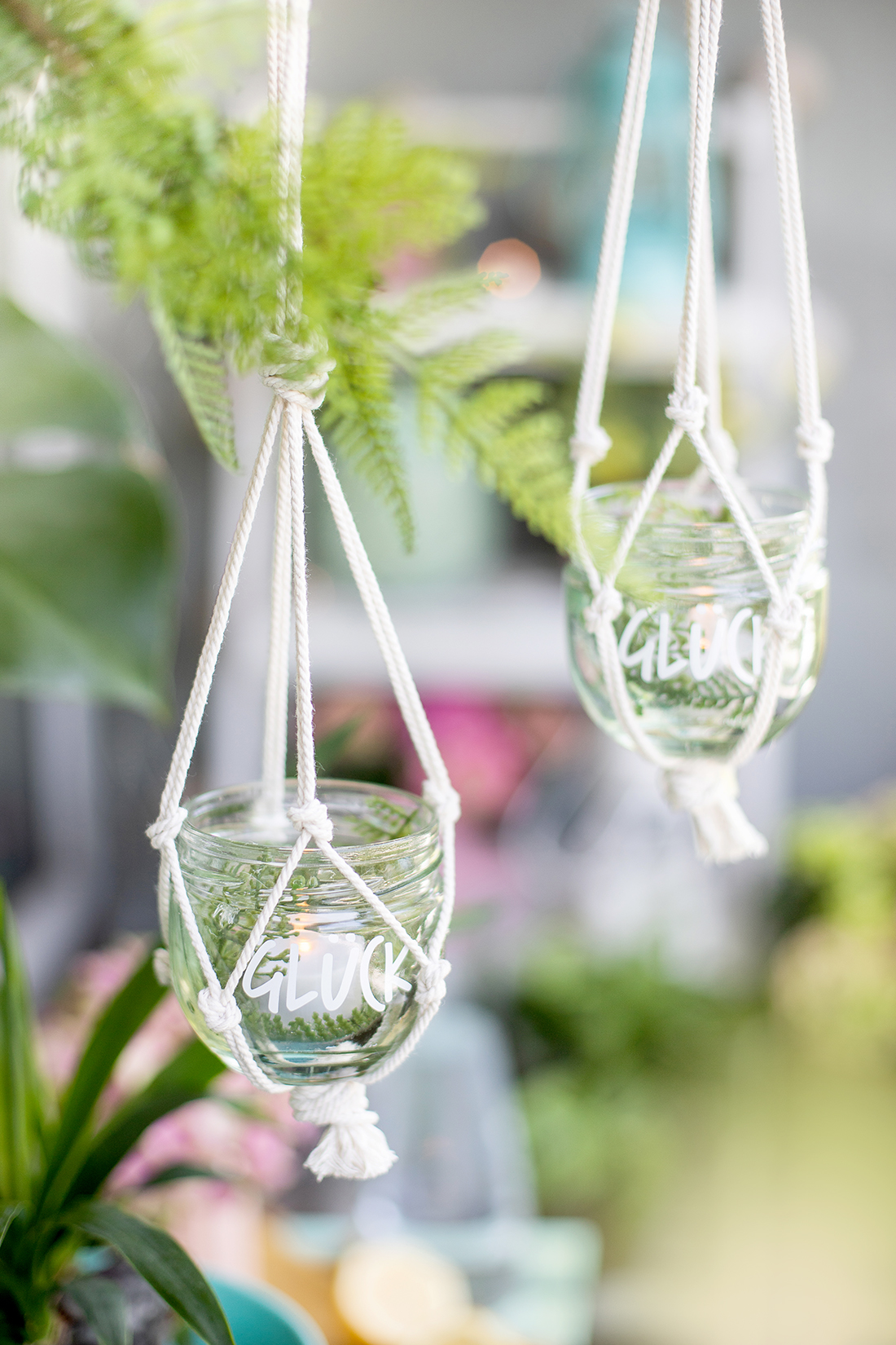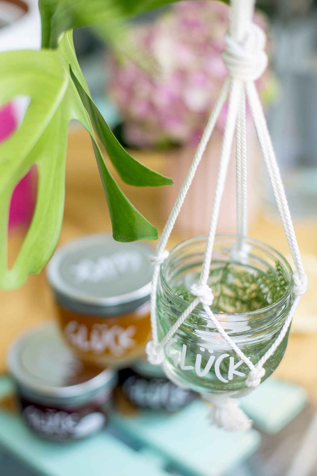 Passend zu unserem Thema „Sommerparty“ habe ich mit unserem Partner GLÜCK eine DIY-Deko-Idee für die Sommerparty umgesetzt. GLÜCK hat nämlich ganz tolle Marmeladen im Sortiment – und diese Marmeladen haben die wahrscheinlich schönsten Gläser, die sich ganz wunderbar zum Weiterbasteln eignen. Ich habe die leeren Marmeladengläser mit Blättern geschmückt und ein ganz einfaches Makramee-Netz geknotet. So werden die Marmeladengläser zu super schönen Deko-Windlichtern auf der Sommerparty.