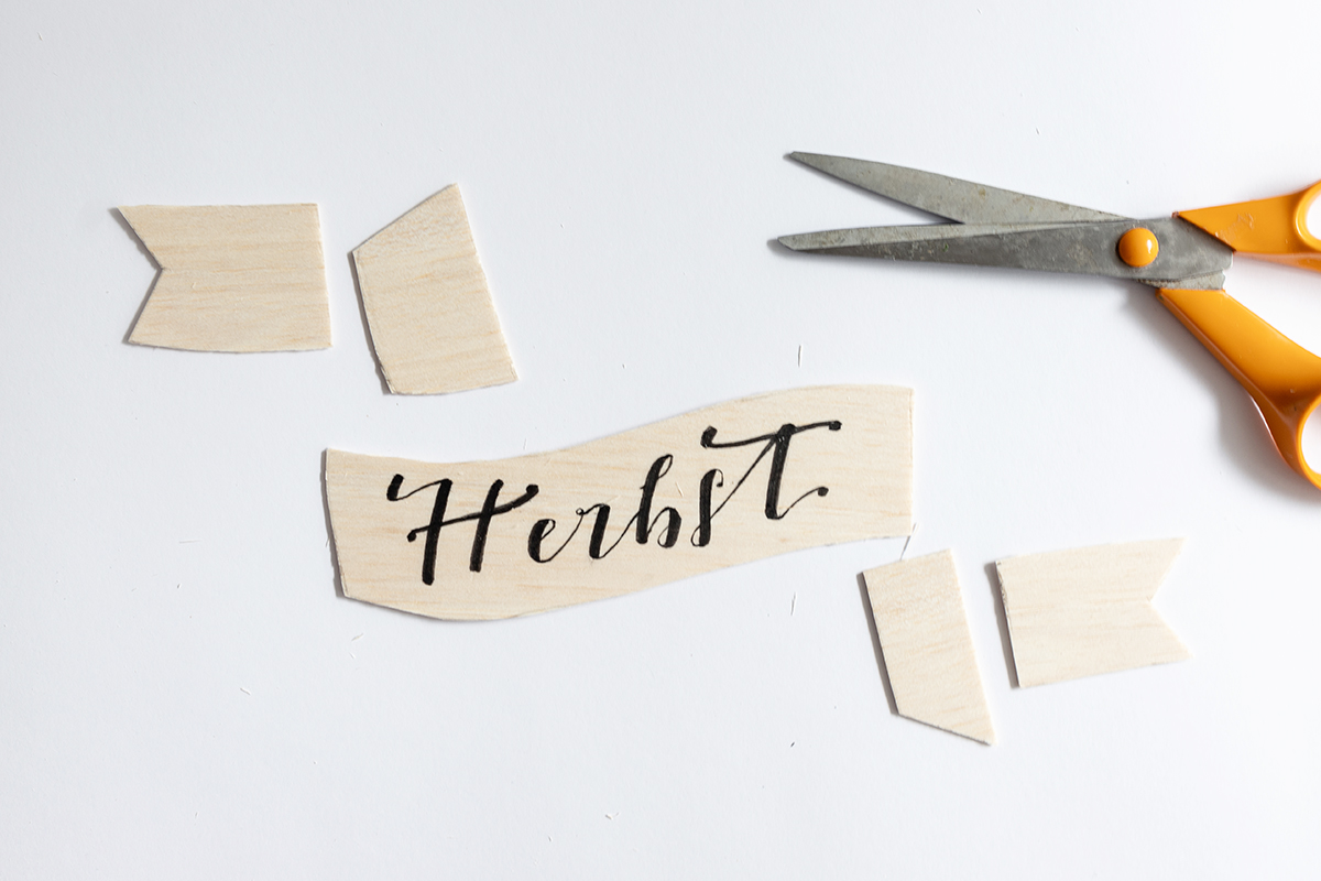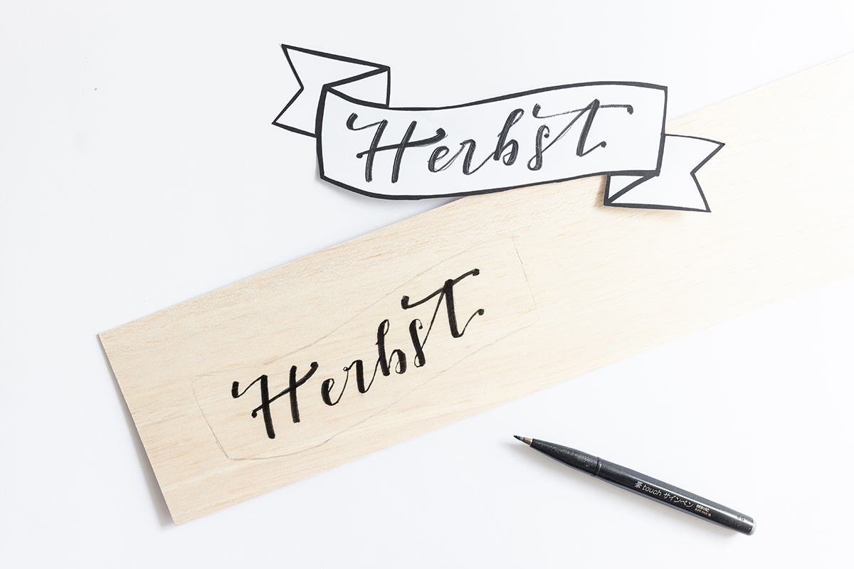 1. Im ersten Schritt überträgst du das Lettering auf das Holz. Du kannst dafür einfach die Vorlage anlegen und mit einem Bleistift ganz sanft die Buchstaben nachzeichnen. Balsaholz ist sehr weich, du wirst die Buchstaben dann im Holz sehen. Dann kannst du sie mit deinem Brushpen nachzeichnen.