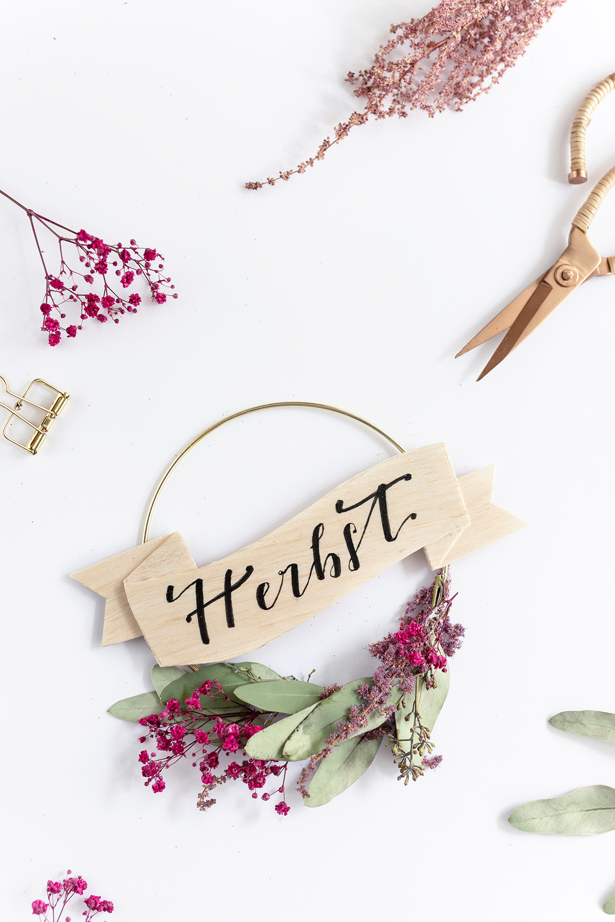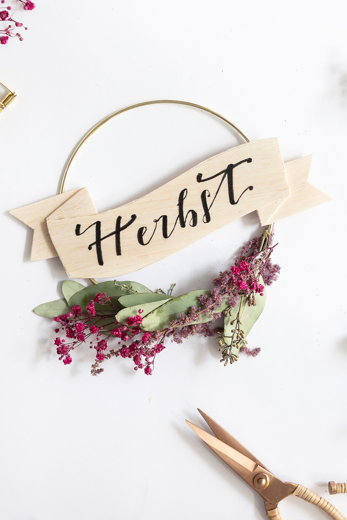 4. Genauso wird das Banner dann auch einfach auf den Ring geklebt – einfach links und rechts am Ring je einen Klebepunkt setzen. Wenn du es gern minimalistisch magst, kannst du deinen Ring einfach so lassen. Ich mag es eher maximalistisch, deshalb gibt es bei mir noch einige tolle getrocknete Blumen, die ich mit Draht in der unteren Hälfte des Ringes befestige.