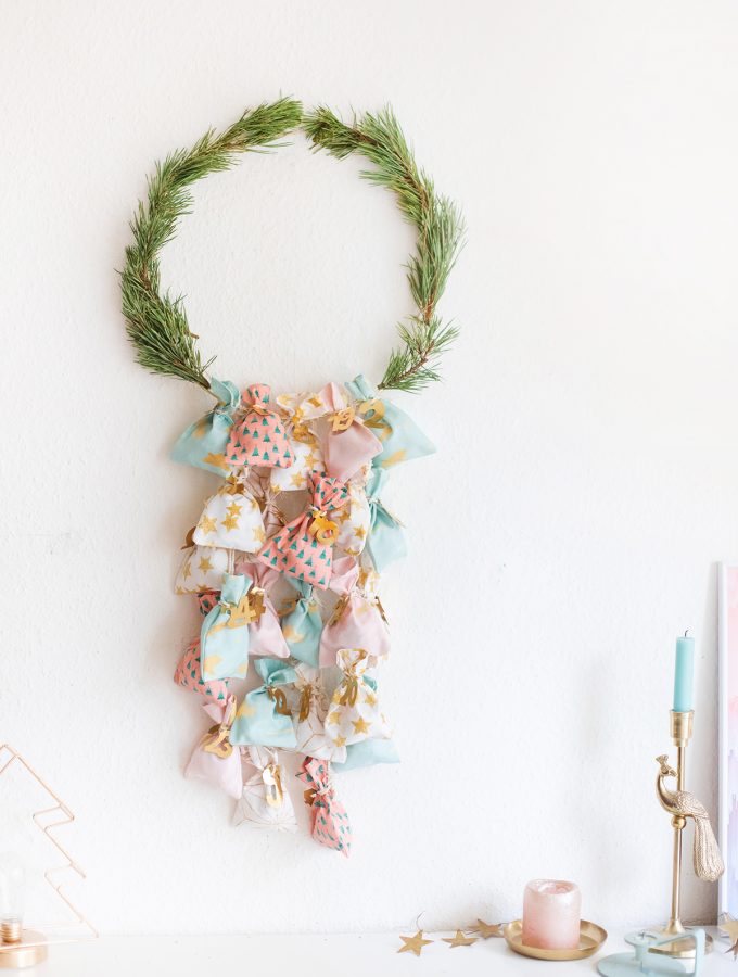 DIY: Adventskalender mit Säckchen nähen – mit Goldring und Lichterkette