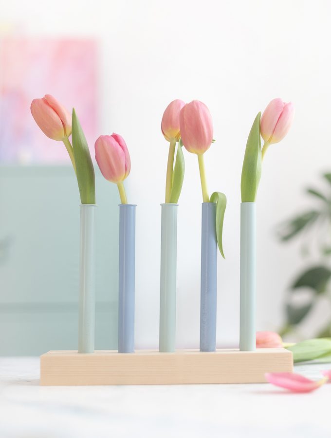 DIY Deko: Bunte Blumenvasen aus Holz und Reagenzgläsern