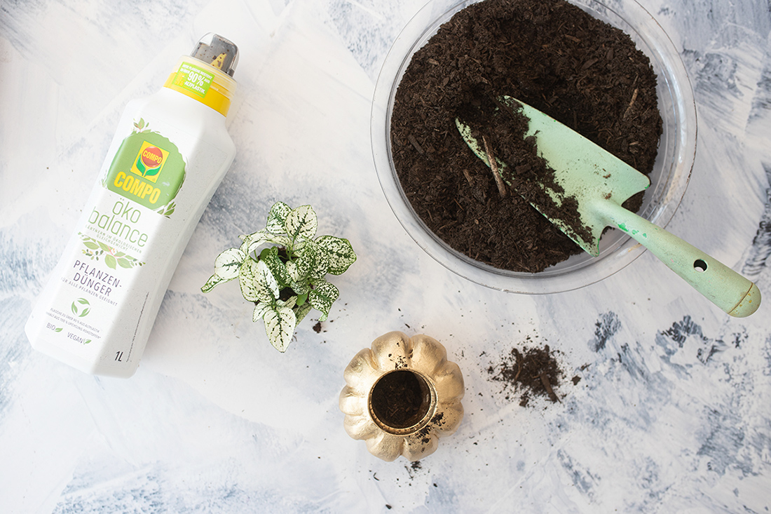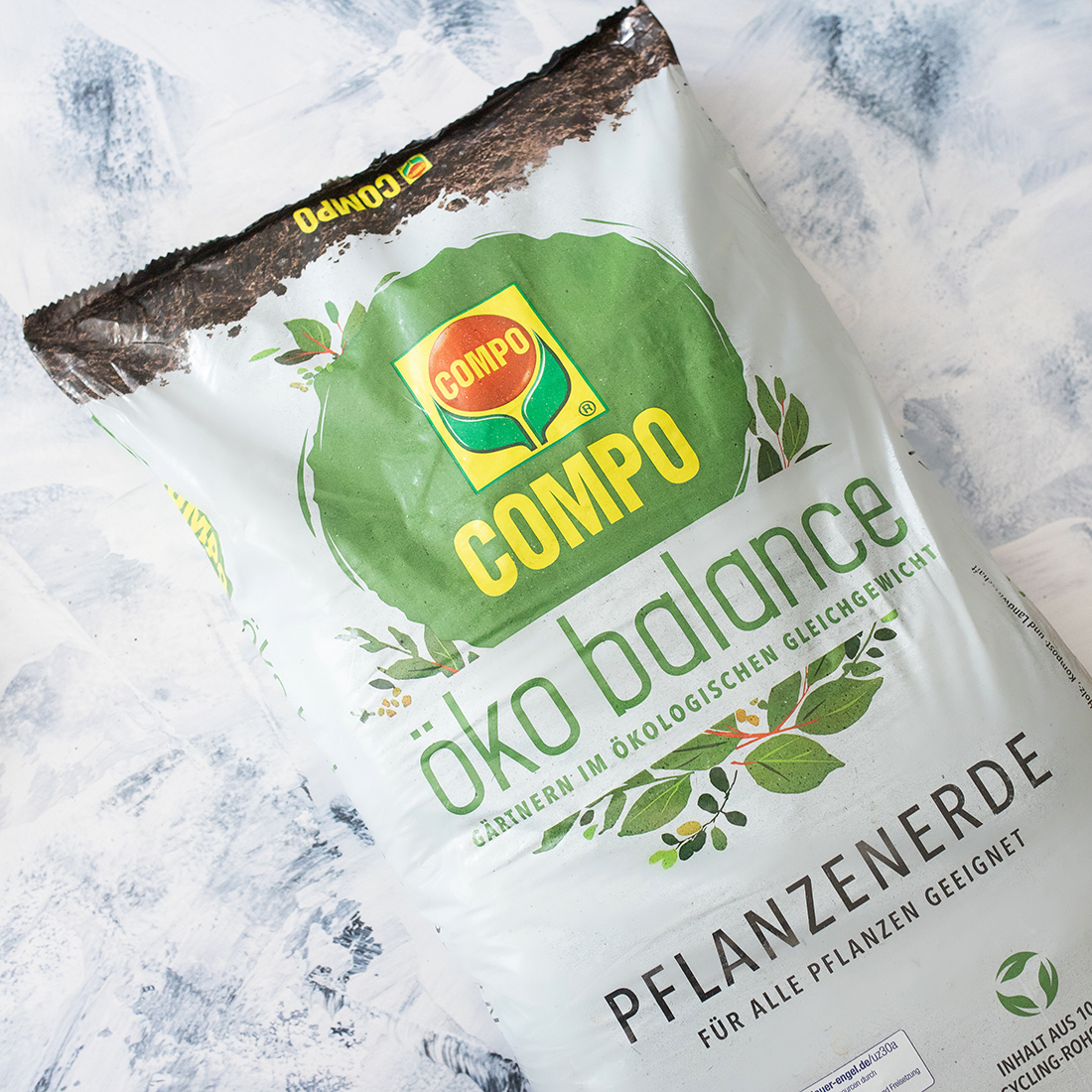 COMPO hat eine große Auswahl an allen möglichen Blumenerden und Düngern. Ich habe mich für die Öko-Varianten entschieden. Bei meiner DIY-Idee habe ich die Compo Öko Balance Pflanzerde verwendet. Das Tolle daran: Die Erde wird komplett aus Reststoffen der Holz-, Kompost- und Landwirtschaft gewonnen und wiederverwertet. Passend dazu nutze ich einen Dünger aus der Öko Balance Reihe. Der besteht auch zu 100% aus Upcycling-Rohstoffen. Sowohl der Dünger, als auch die Erde sind Bio und Vegan.