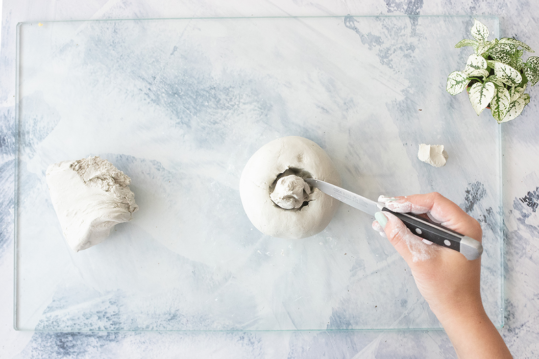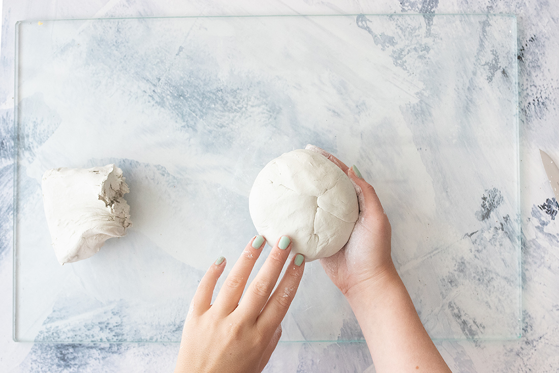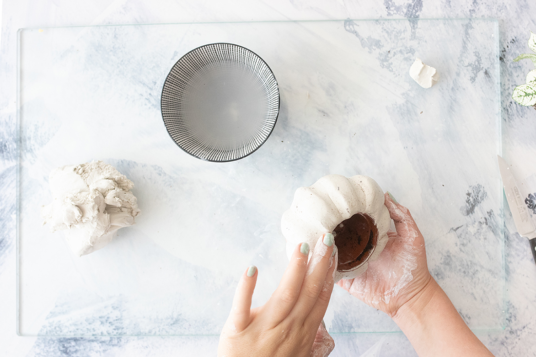 1. Forme im ersten Schritt eine große Kugel aus der Modelliermasse. Achte darauf, dass dein Pflanztopf gut in die Mitte passt. Passe die Größe der Kugel entsprechend an. Drücke die Kugel etwas platt, sodass sie nicht ganz rund ist, sondern eher eine flache Form hat – wie ein Kürbis eben.