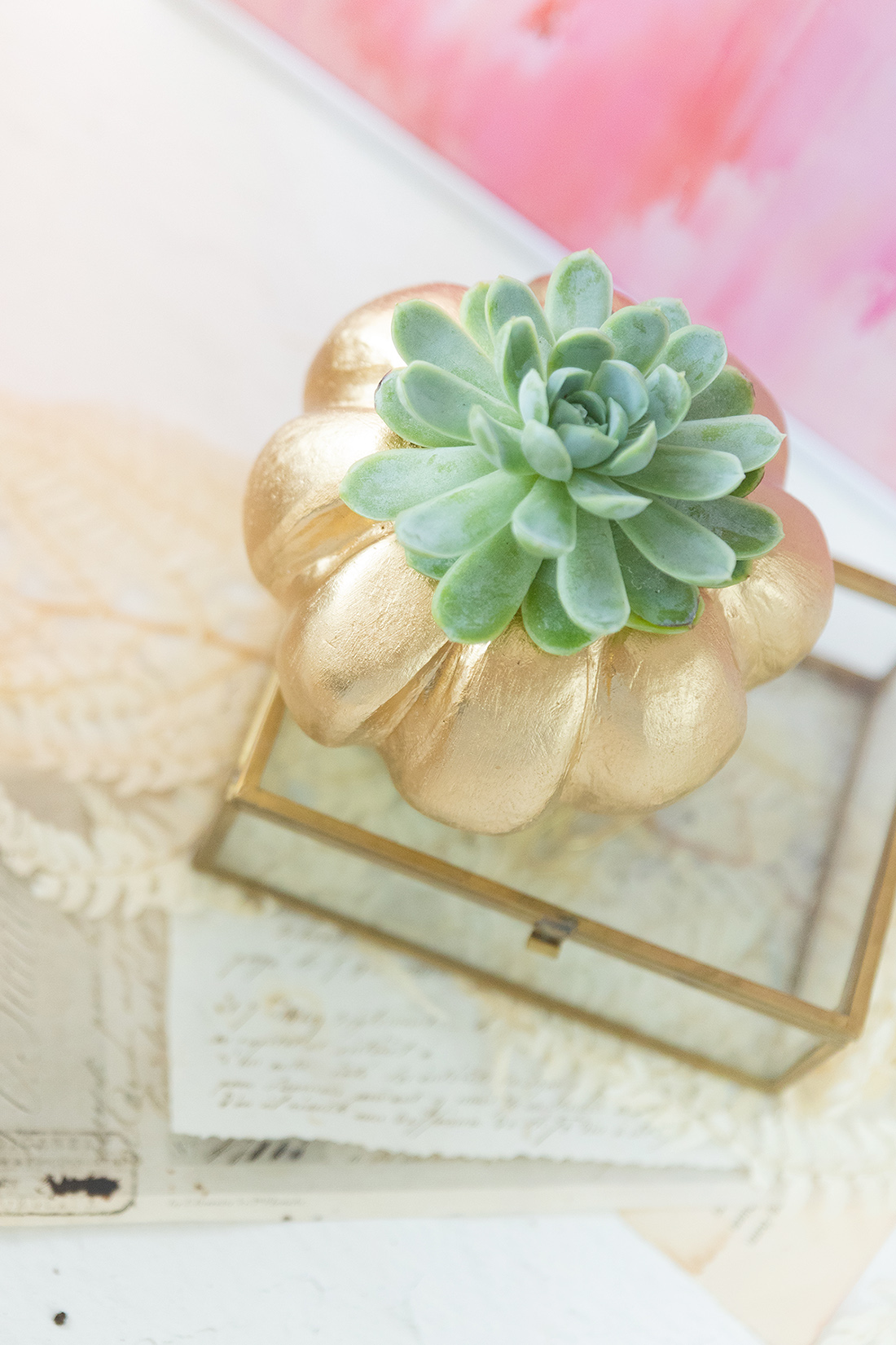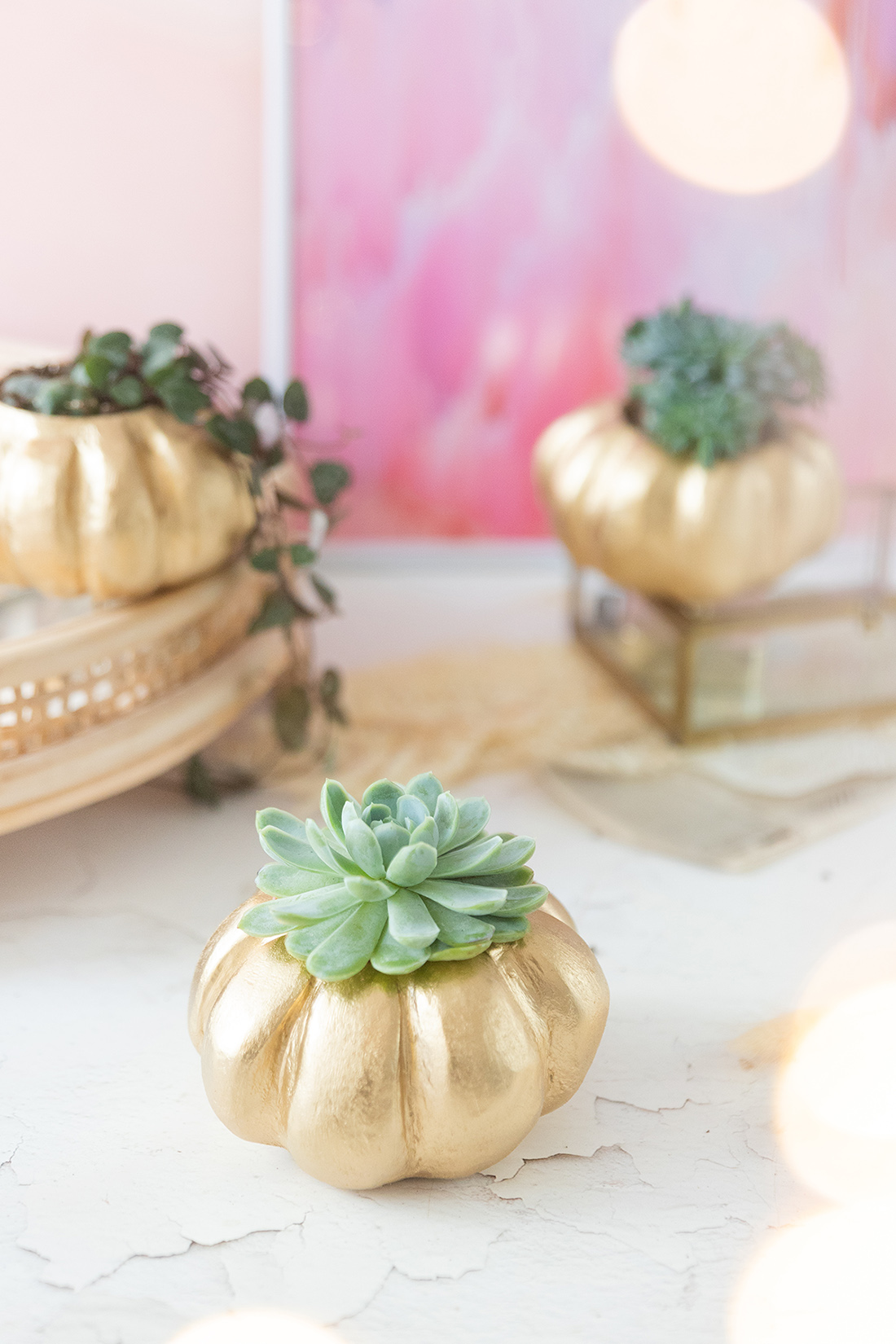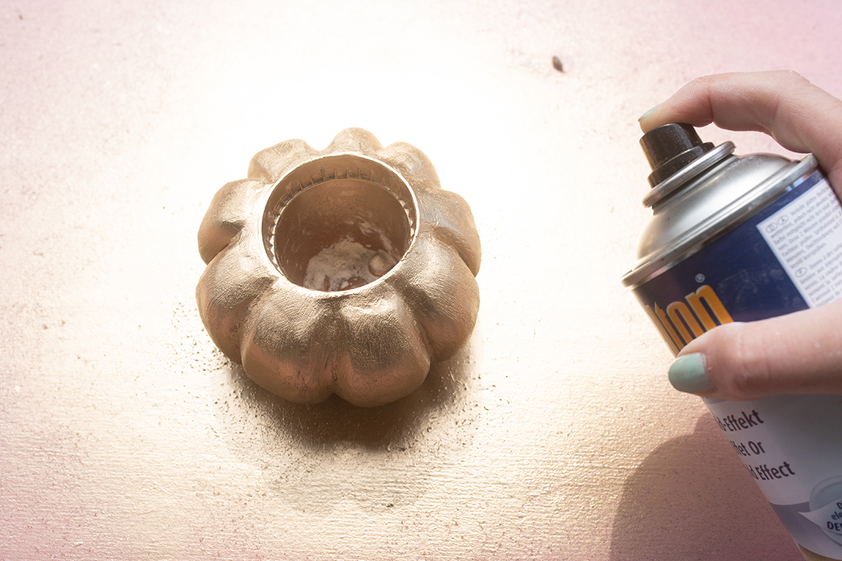 Wenn du möchtest, kannst du deinen Kürbis nun noch bemalen oder besprühen. Ich habe mich für Goldspray entschieden, da ich finde, das sieht super schön edel aus! Lass die Farbe dann gut trocknen.
