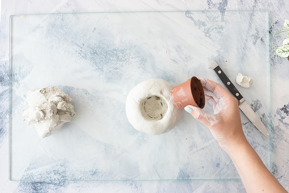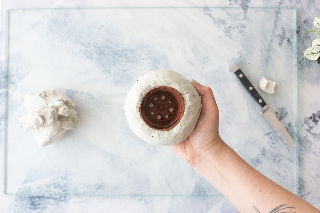 4. Drücke die Modelliermasse so an den Pflanztopf, dass die Ränder damit abschließen.