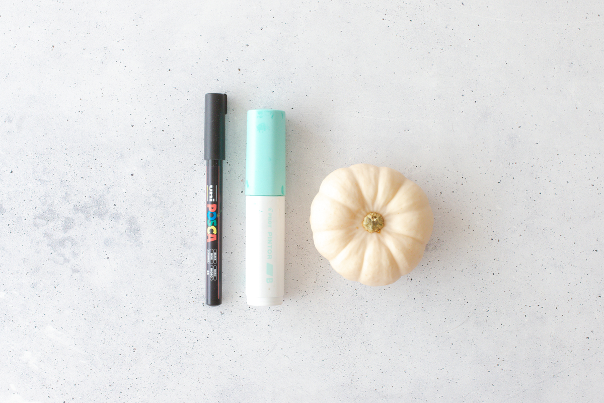1. Zuerst reinigst du den Kürbis gut, bevor du loslegst. Dann schnappst du dir zwei Permanent-Marker. Eine Farbe deiner Wahl und einen dünnen Marker in Schwarz. Ich habe mich für Schwarz in Kombination mit Mint entschieden.