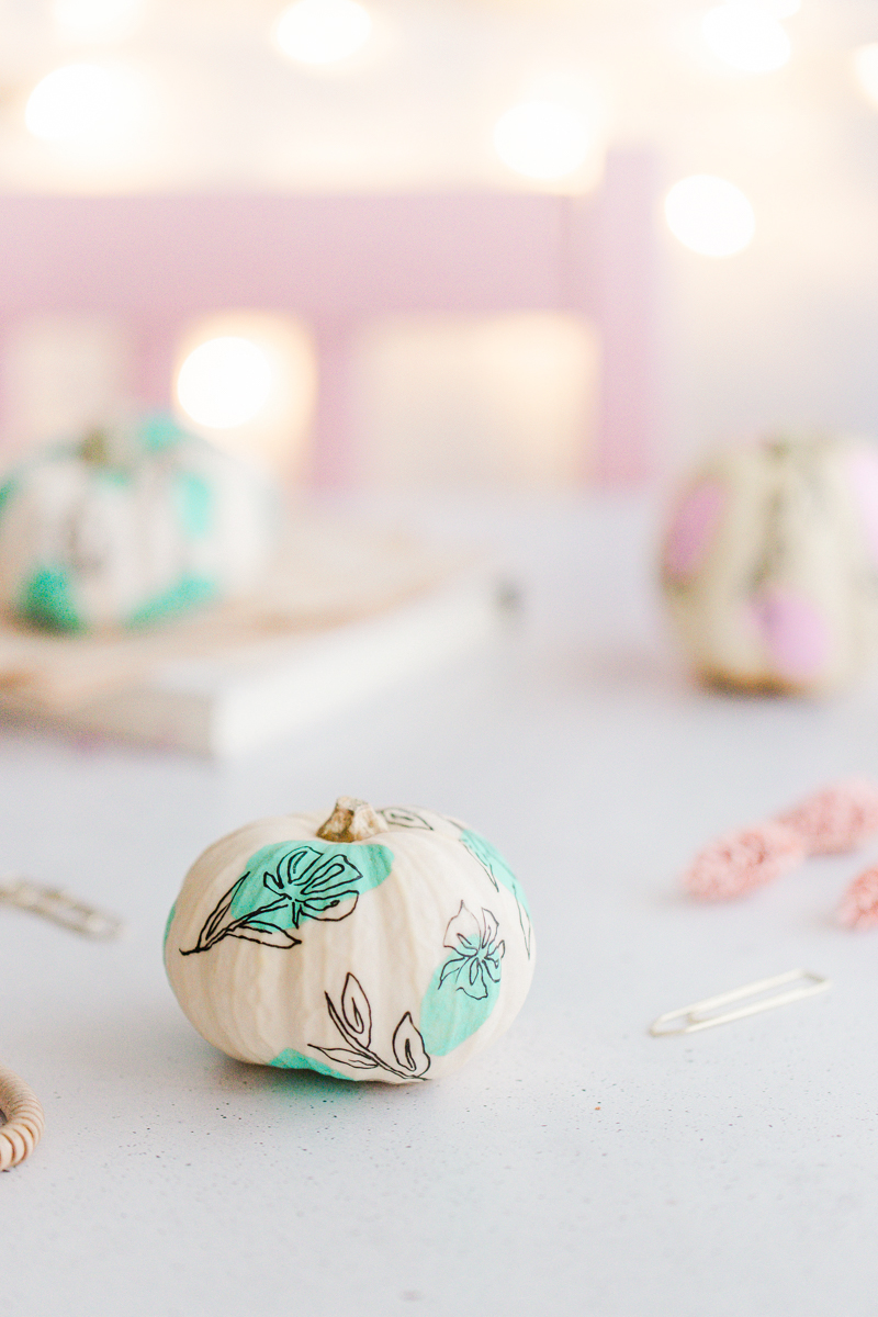 3. Wenn die Farbe getrocknet ist, schnappst du dir deinen schwarzen Marker und zeichnest florale Elemente auf den Kürbis. Diese dürfen mit den Farbkreisen überlappen. Besonders schön sieht es aus, wenn deine Blätter und Blumen in die Farbkreise hinein ragen. Male nun so viele Elemente, bis der Kürbis gut gefüllt ist. Die Elemente dürfen gerne von oben und unten kommen und in verschiedene Richtungen zeigen.