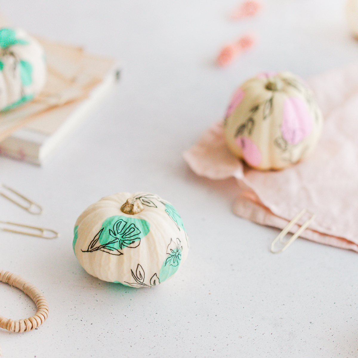 Nun zu meiner Idee: Ich steh‘ gerade total auf DIY-Ideen mit Lineart, also ganz simplen Mustern, die oft aus einer einzigen Linie gezeichnet werden – hinzu kommen ein paar asymmetrische Farbakzente. Ich finde, dass das super hübsch und edel aussieht. Außerdem ist es ganz einfach zu machen. Ich zeige dir in diesem Beitrag, wie du Kürbisse mit Lineart hübsch gestalten kannst.