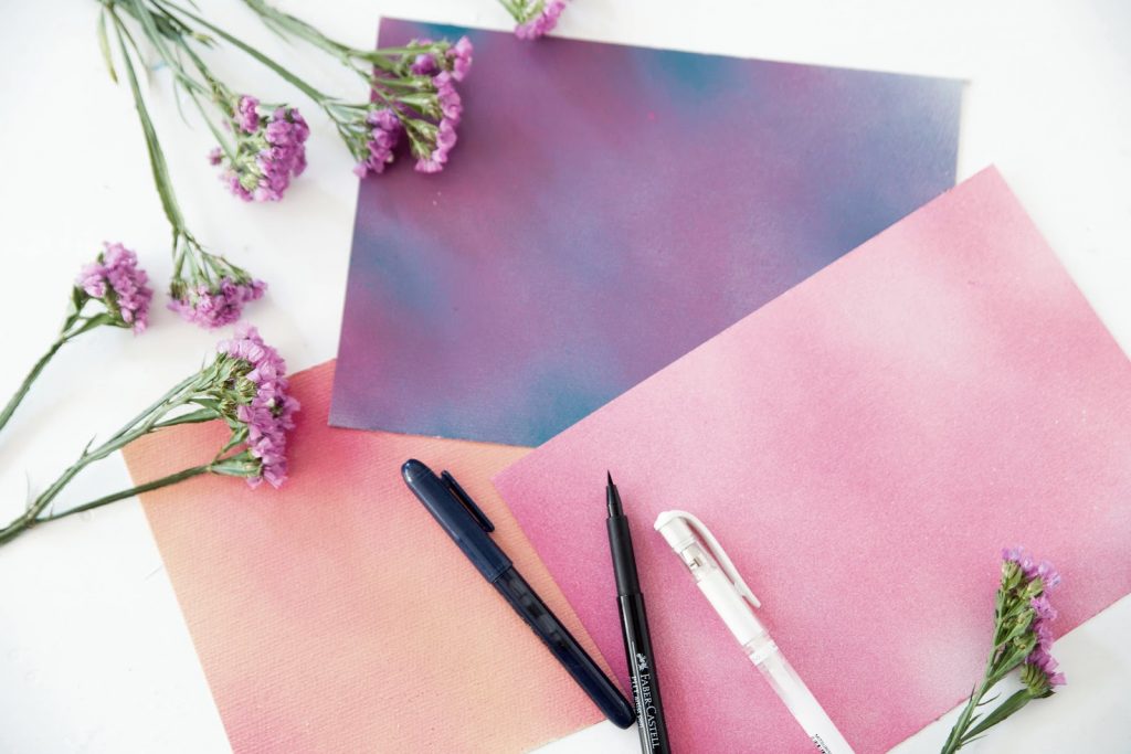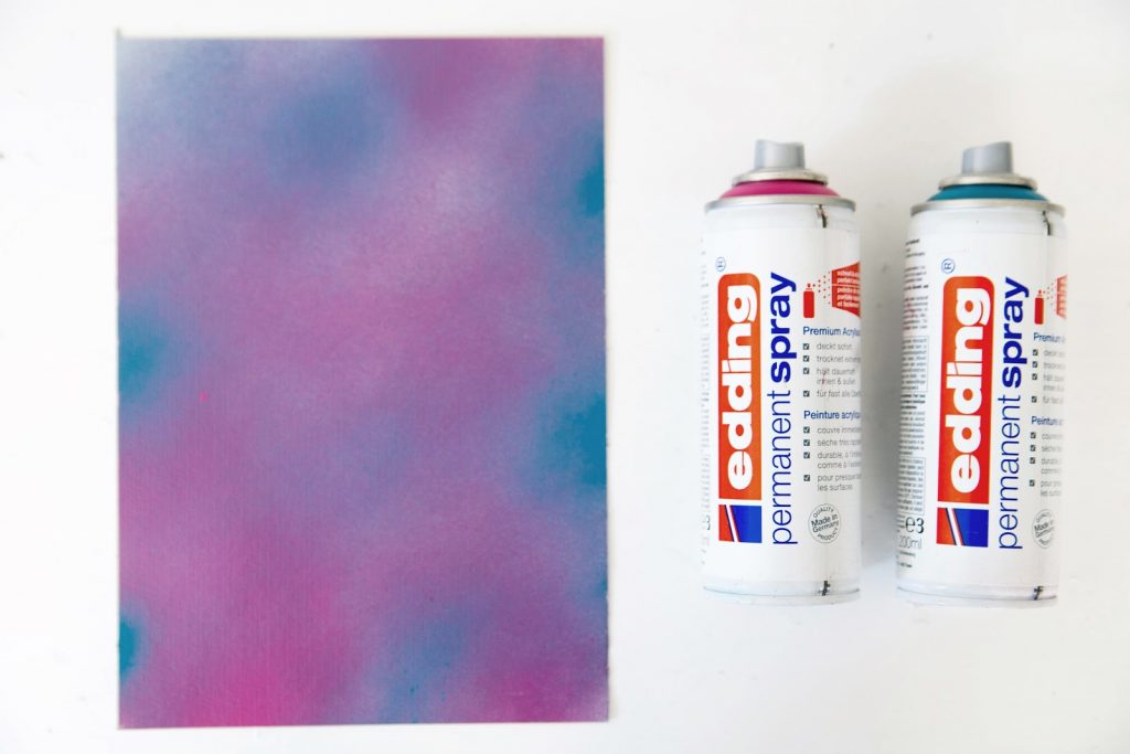 Ihr könnt euch aber auch viel wilder austoben mit Farbe Nummer zwei – wenn ihr diese einfach auf mehrere Stellen übers Papier verteilt sprüht, erzielt ihr einen schicken Airbrush-Effekt. Das sieht auch ziemlich gut aus und ich überlege schon, was ich mit den übrigen Papieren noch mache!