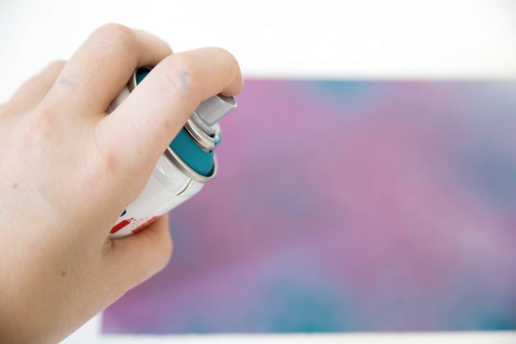 2. Wenn die erste Farbe trocken ist, habt ihr mehrere Möglichkeiten. Wenn ihr einen Farbverlauf erzielen wollt, sprüht ihr mit der anderen Farbe von einem Ende des Papieres schräg nach oben. Das sieht dann so aus wie auf meinem fertigen Foto.