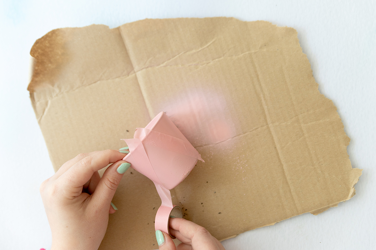 1. Im ersten Schritt reinigst du den Pflanztopf und trocknest ihn. Dann sprühst du ihn rundherum mit dem rosa Acrylspray ein. Arbeite in vielen kleinen Sprühstößen, sodass sich keine Farbnasen bilden (Das passiert, wenn du viel Farbe auf einmal auf eine Stelle kommt.) Lieber arbeitest du in mehreren Schichten, statt zu viel Farbe auf einmal auf den Pflanztopf zu geben. Lasse die erste Schicht trocknen und arbeite dann wieder in der nächsten Schicht, bis der Pflanztopf rundherum mit Farbe bedeckt ist.