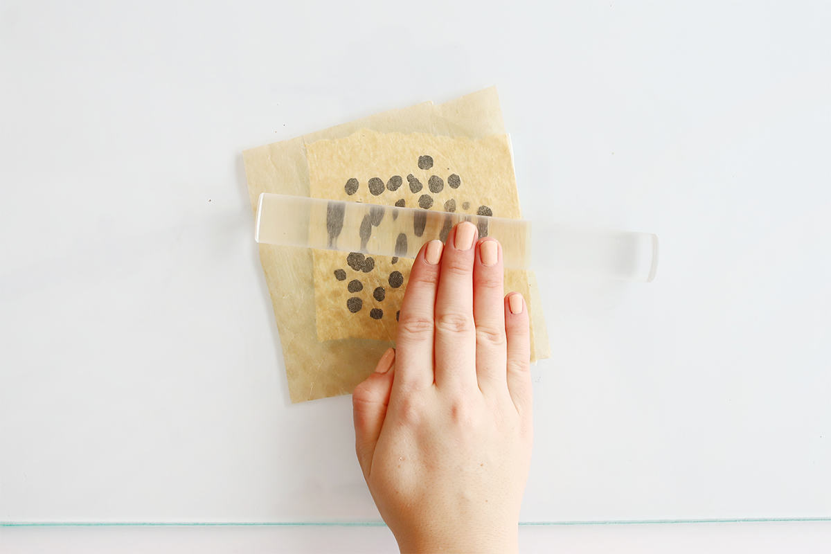 3. Nun das FIMO leather-effect auf Backpapier platzieren und auch ein Stück Backpapier von oben über das FIMO leather-effect legen. Mit dem Acrylroller über das Backpapier rollen, bis man keine Unebenheit mehr am Übergang zum weißen Fimo sieht. Dann die Platte umdrehen und das Ganze von der anderen Seite wiederholen, sodass das FIMO leather-effect von beiden Seiten gepunktet ist.