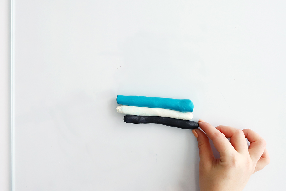 1. Zuerst aus den FIMO-Blöcken jeweils Streifen abschneiden. Die drei Stränge werden jetzt miteinander verzwirbelt und eingedreht. Dann den dicken Strang solange rollen, bis er glatt ist.